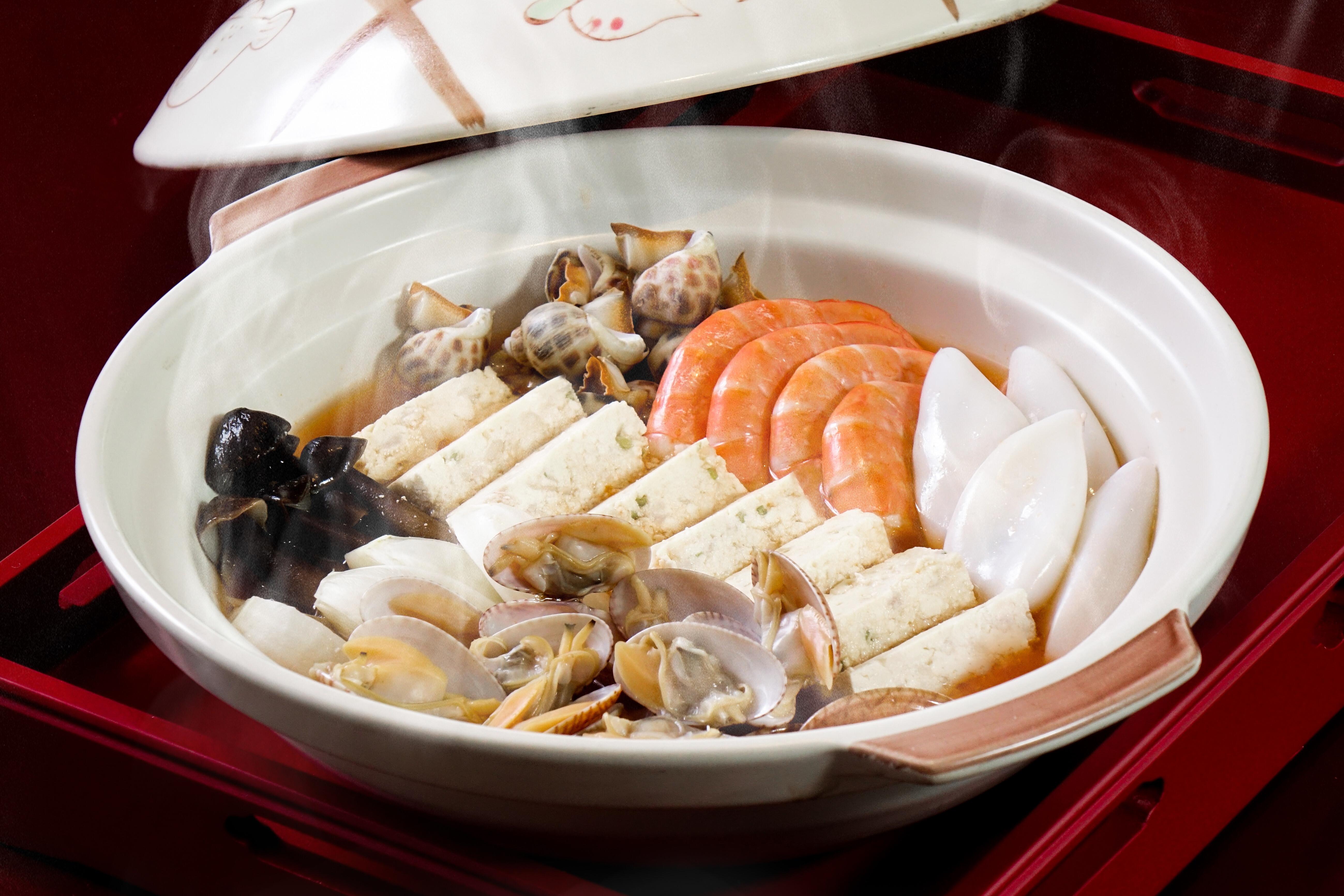今次一系列巧手菜式均由酒店行政中餐總廚何振雄師傅主理,用上罕見食材,為食客帶來多款扎實的心機美饌。最吸引的是梅乾菜筍乾扣羊膝($448),以經典的客家菜梅菜扣肉作靈感,用澳洲羊膝代替五花腩,配合由師傅親自搜羅的梅乾菜及筍乾燜上3小時,羊膝吃起來香嫩鬆化,同時帶有梅菜香氣,愈吃愈開胃。而鶴藪白菜浸自家鱈魚腐腐($468)特別以大西洋鱈魚製作魚腐,魚油較為豐富,做出來的魚腐口感更綿滑,配上用鰂魚、鯪魚熬製的魚湯,湯頭鮮甜滋味。心水之選是砂窩海鮮臭豆腐($598),原鍋上菜,內有各式海鮮包括海蝦、花甲、魷魚、雞樅菌連同摻入了西班牙黑毛豬肉碎、馬蹄及荽芫的手工臭豆腐,並放入泡椒魚湯,用料非常豐盛,而且臭豆腐吸盡湯汁,口感鬆化,菜式風味只此一家。