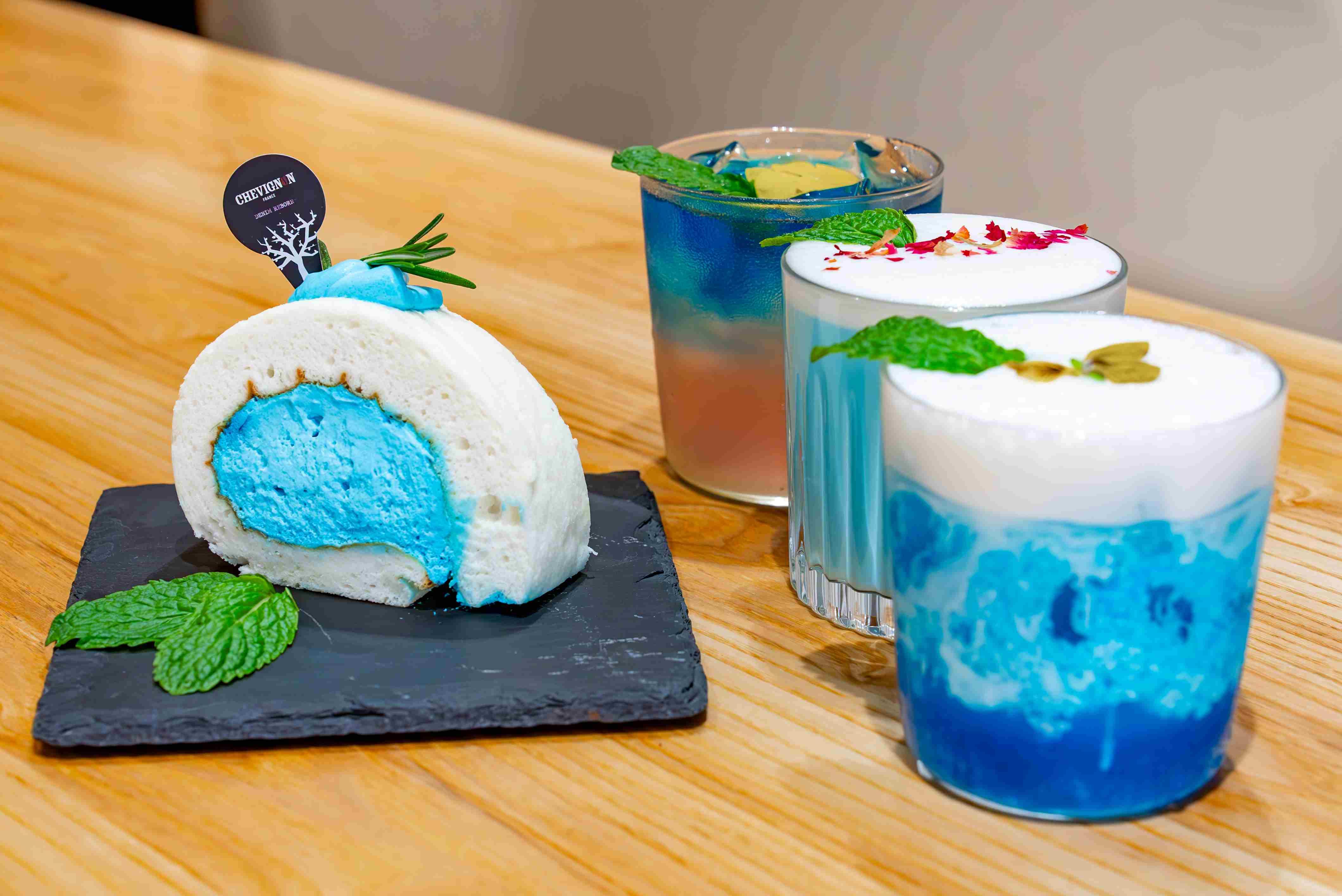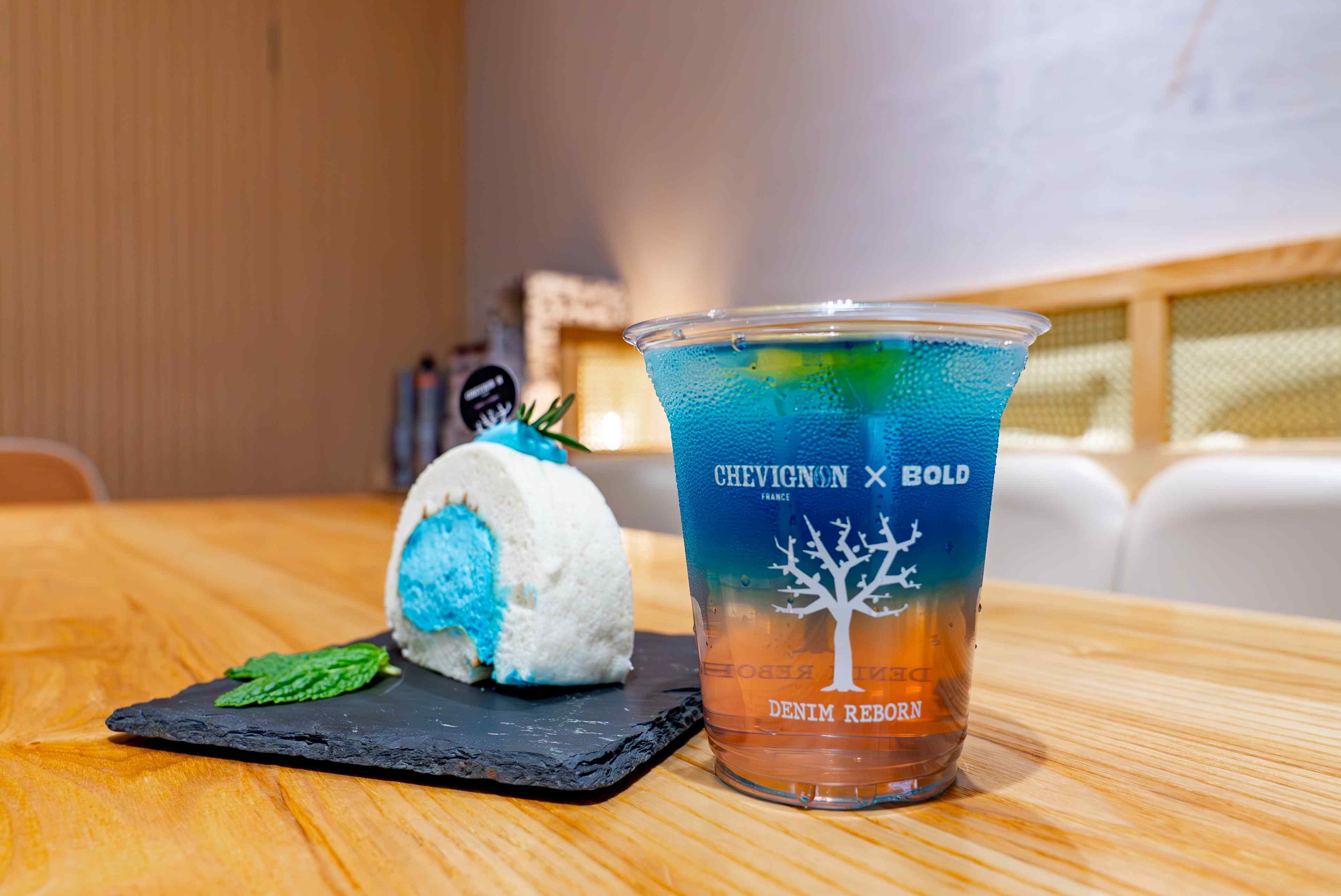 Chevignon 與 BOLD COFFEE 聯手推出期間限定菜單Denim Reborn Cake Set,以牛仔藍為主色,飲品配襯綠葉作為裝飾,呼應是次「Denim Reborn」 聯乘系列。當中包括蝶豆花雲呢拿卷蛋、及檸檬薑味拿鐵(熱);或 藍天(凍);或 蜂蜜檸檬薑味蝶豆花茶(凍)。