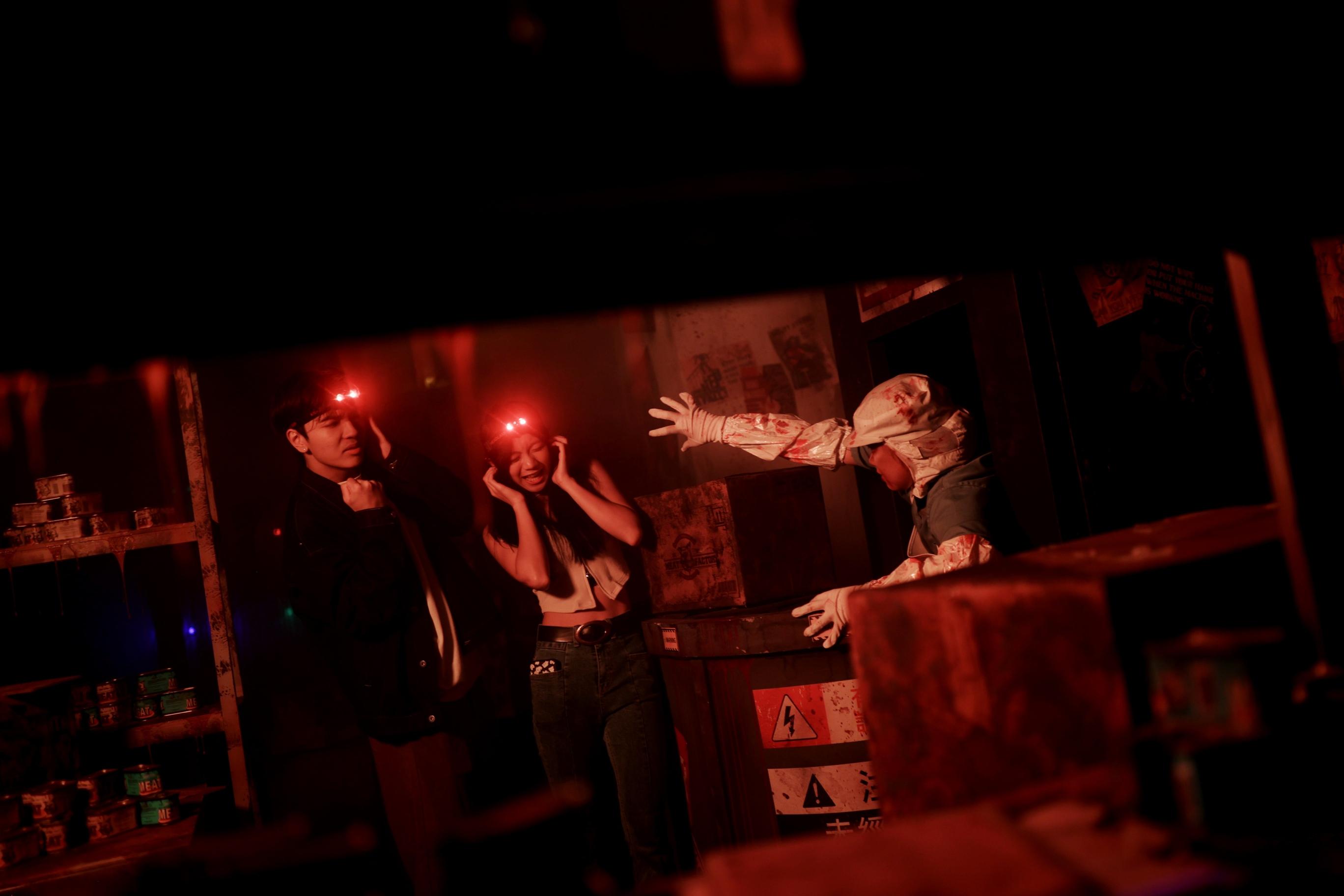 「724禁地」以廢棄製肉工廠作主題,記者入場前要戴上頭燈,逐一走入消毒房間,如習慣集體行動的膽小者已經難單獨踏進狹窄房間裏。工廠內吊起大量的肉製品及不斷傳來的電鋸聲讓人膽顫心驚。