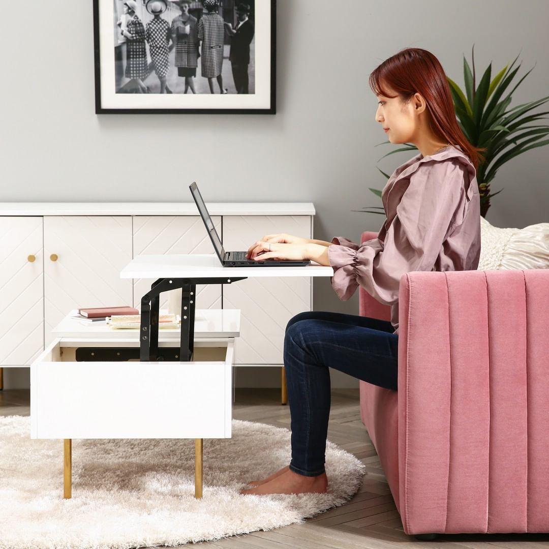 多功能茶几,設收納抽屜及可升降桌面,高度適合用餐或工作,用色設計簡約華美,輕鬆配合不同風格客廳。