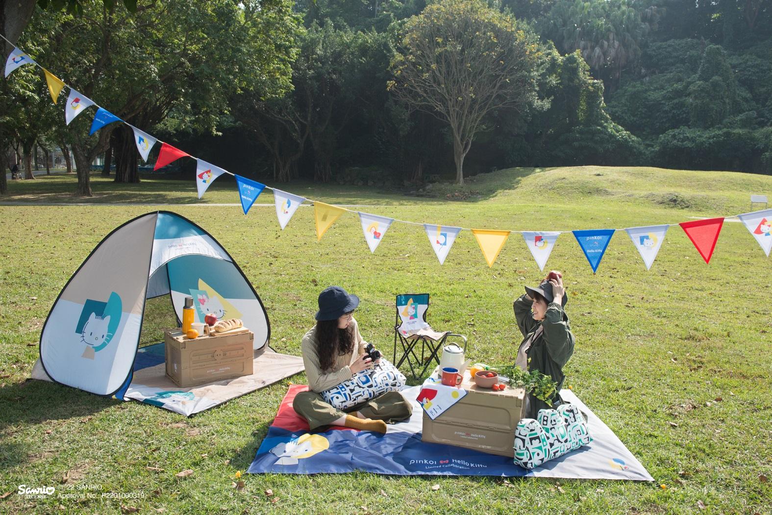 「Pinkoi x Hello Kitty 限定聯名野餐輕裝備」套裝A包括:野餐墊 x 1、三角掛旗 x 1及戶外折疊帳篷 x 1