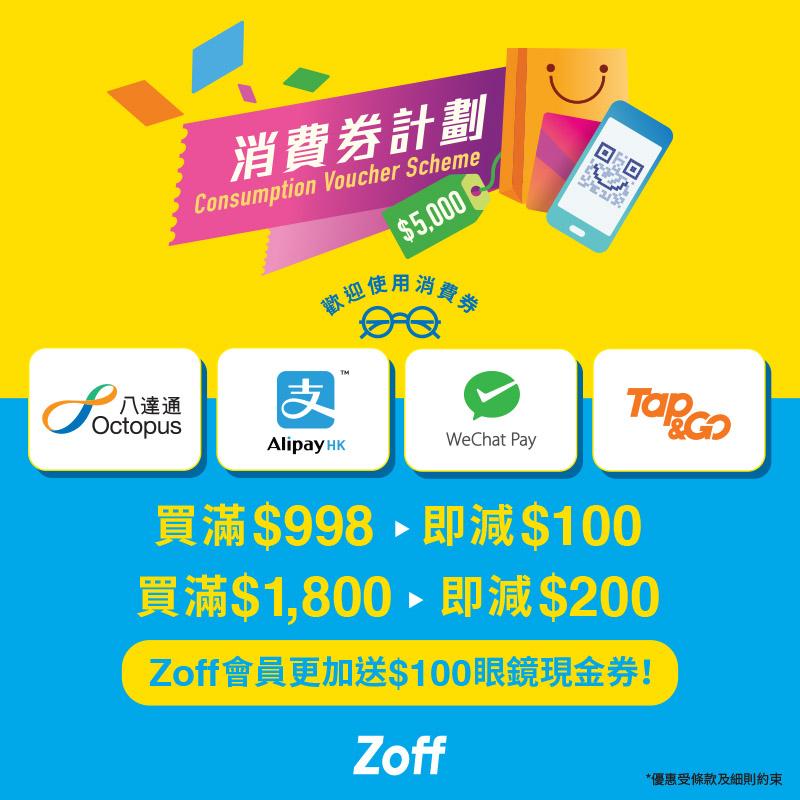 由即日起至6月30日,顧客於Zoff以電子支付 (八達通、Alipay、WeChatPay及Tap&Go)消費,購物滿$998即減$100;滿$1,800即減$200,買得愈多減得愈多。Zoff會員更可於額外獲得$100眼鏡現金券1張。