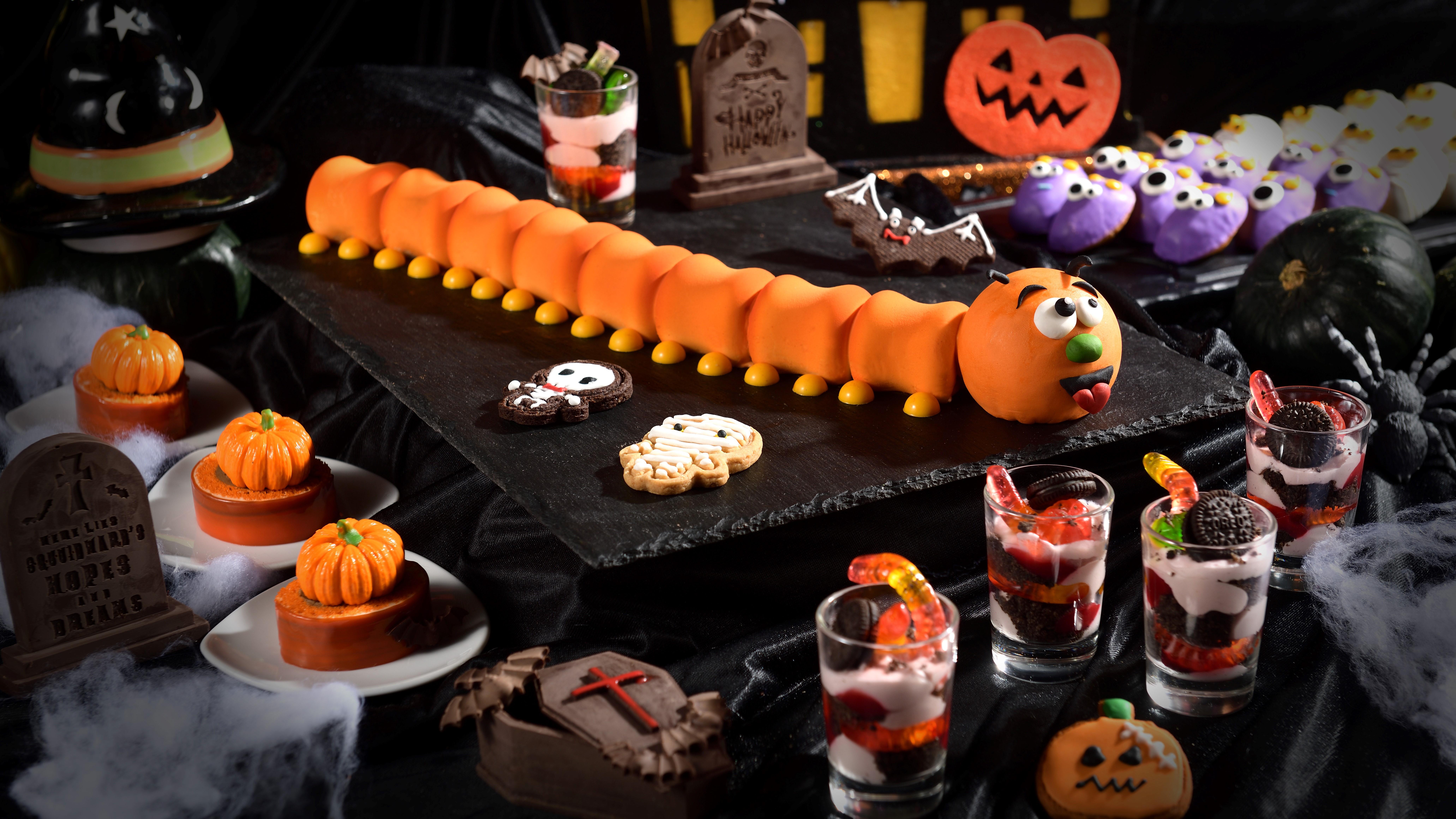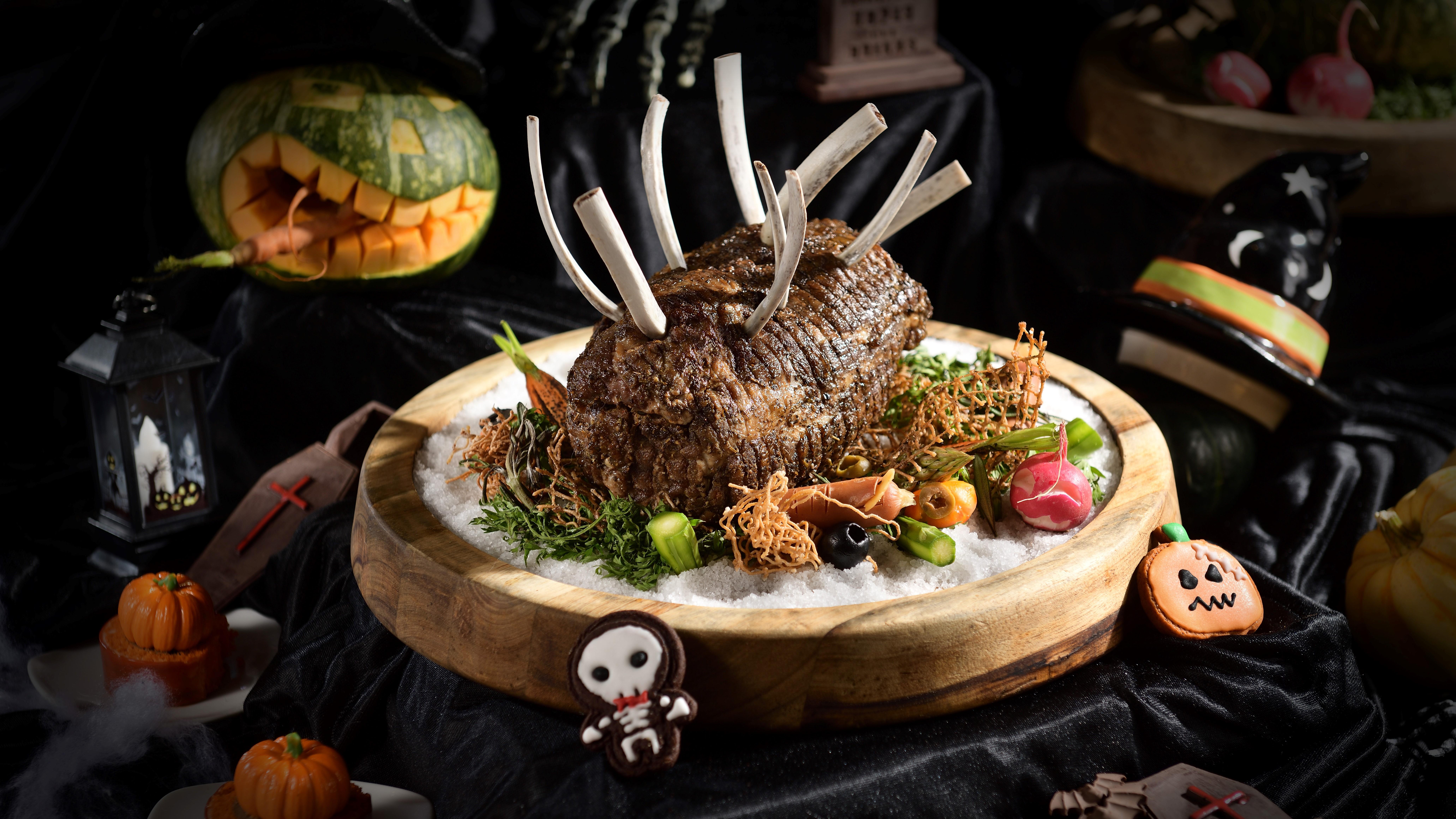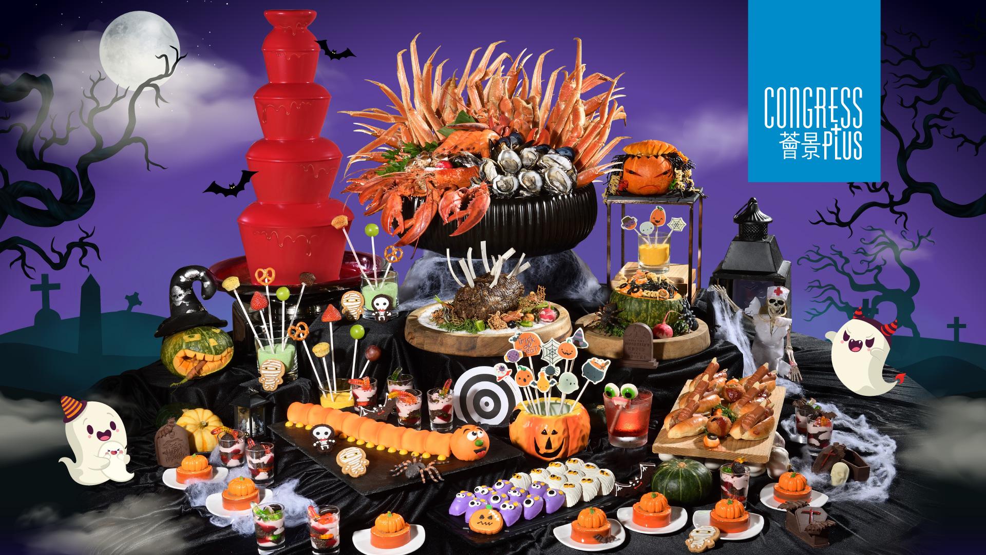 廚師團隊準備了多款令人垂涎的新鮮海鮮,包括有即開生蠔、長腳蟹、加拿大波士頓龍蝦、青口及海蝦以外, 更有以萬聖節為主題的賣相鬼馬的一系列美食,如牛魔王(燒美國特級牛肉 )及驚嚇度十足的血池地獄 (朱古力噴泉)等,每晚源源不絕為您輪流奉上,充滿怪搞的歡樂氣氛。賓客更可無限量享用精選葡萄酒和美國啤酒,與摯愛親朋來一趟神秘之旅。小朋友記得不要錯過每晚8時舉行的Trick or Treat,一齊度過一個開心難忘的萬聖節吧!