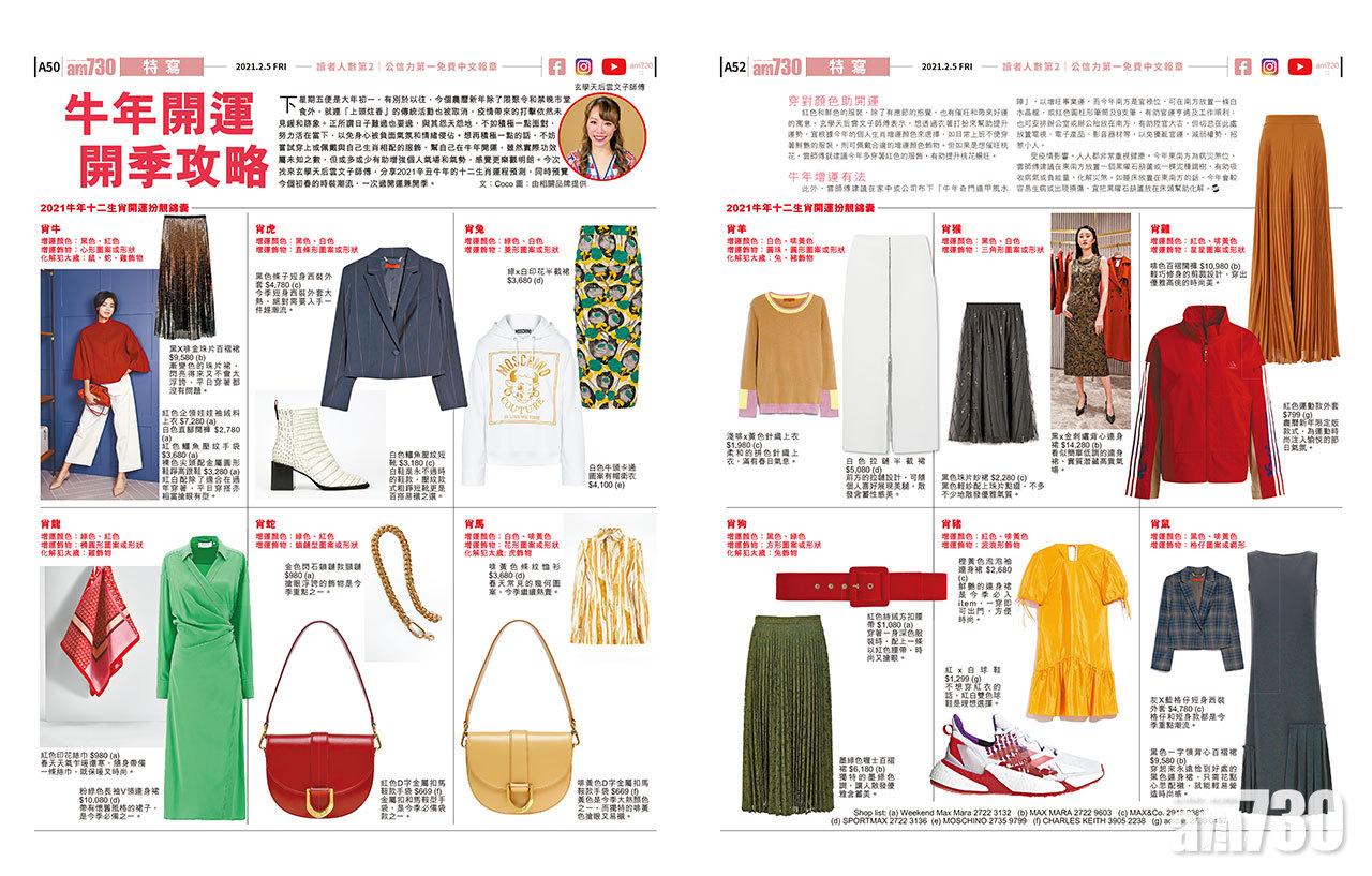 下星期五便是大年初一,有別於以往,今個農曆新年除了限聚令和禁晚市堂食外,就連「上頭炷香」的傳統活動也被取消,疫情帶來的打擊依然未見緩和跡象。正所謂日子難過也要過,與其怨天怨地,不如積極一點面對,努力活在當下,以免身心被負面氣氛和情緒侵佔。想再積極一點的話,不妨嘗試穿上或佩戴與自己生肖相配的服飾,幫自己在牛年開運,雖然實際功效屬未知之數,但或多或少有助增強個人氣場和氣勢,感覺更樂觀明朗。今次找來玄學天后雲文子師傅,分享2021辛丑牛年的十二生肖運程預測,同時預覽今個初春的時裝潮流,一次過開運兼開季。