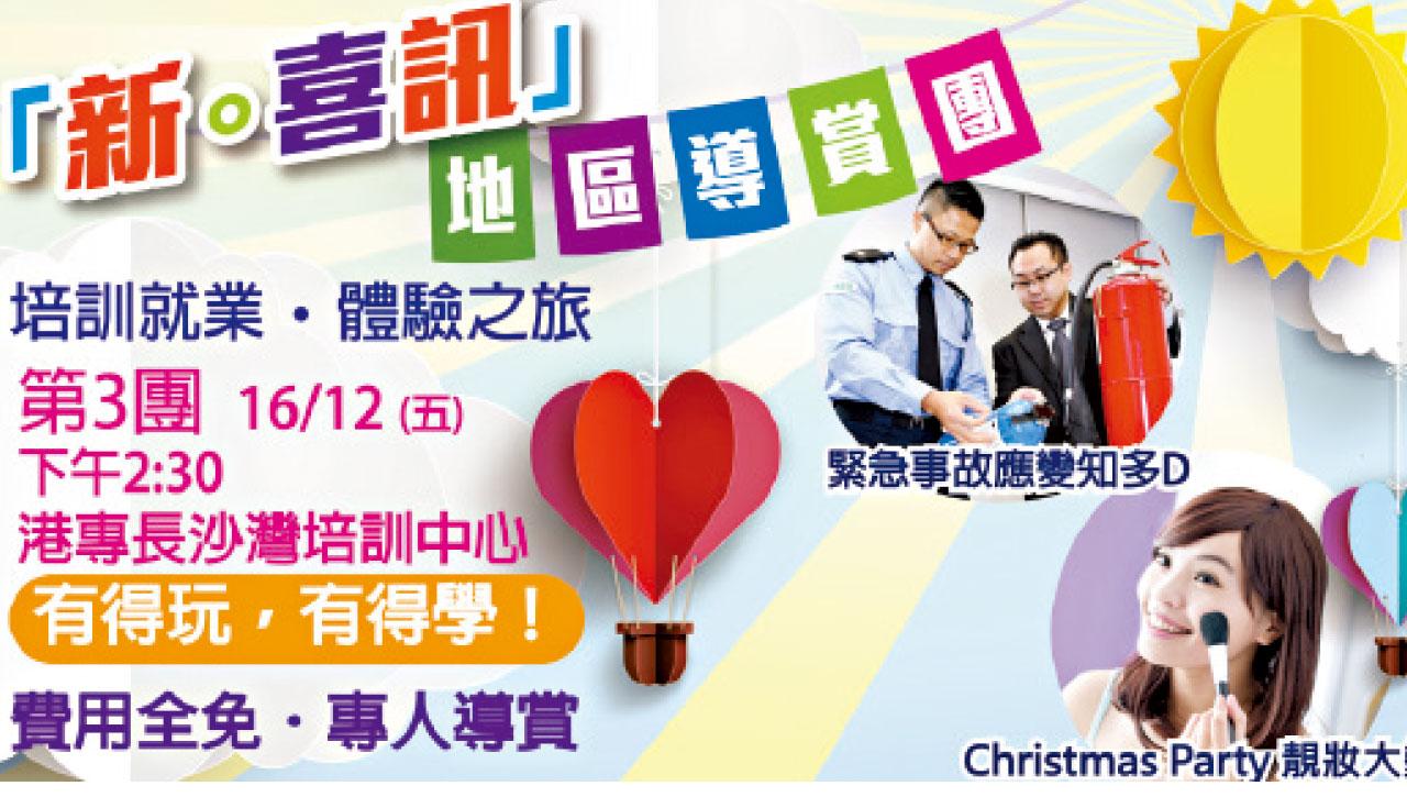 港專職業訓練學院將於12月16日(星期五)下午2時30分假長沙灣培訓中心舉辦「『新‧喜訊』地區導賞團」,助參加者了解職業志向、認識各行業入職要求、職場技能、發展機會及工作實況!「高級保安及物業管理基礎證書課程」課程導師將主持《緊急事故應變知多D》環節,而「化妝助理基礎證書」課程導師將介紹《Christmas Party 靚妝大變身》的要訣,參加者可了解更多關於物業管理及保安與美容行業的工作實況!「塞科利達保安服務(香港)有限公司」代表將安排進行實地參觀及即場招聘。透過參觀「港專長沙灣培訓中心」,可了解中心服務及設施,並了解市場及就業情況,提升求職及工作技巧。歡迎15歲或以上人士報名參加,費用全免!有得玩,有得學!(活動由ERB資助)
