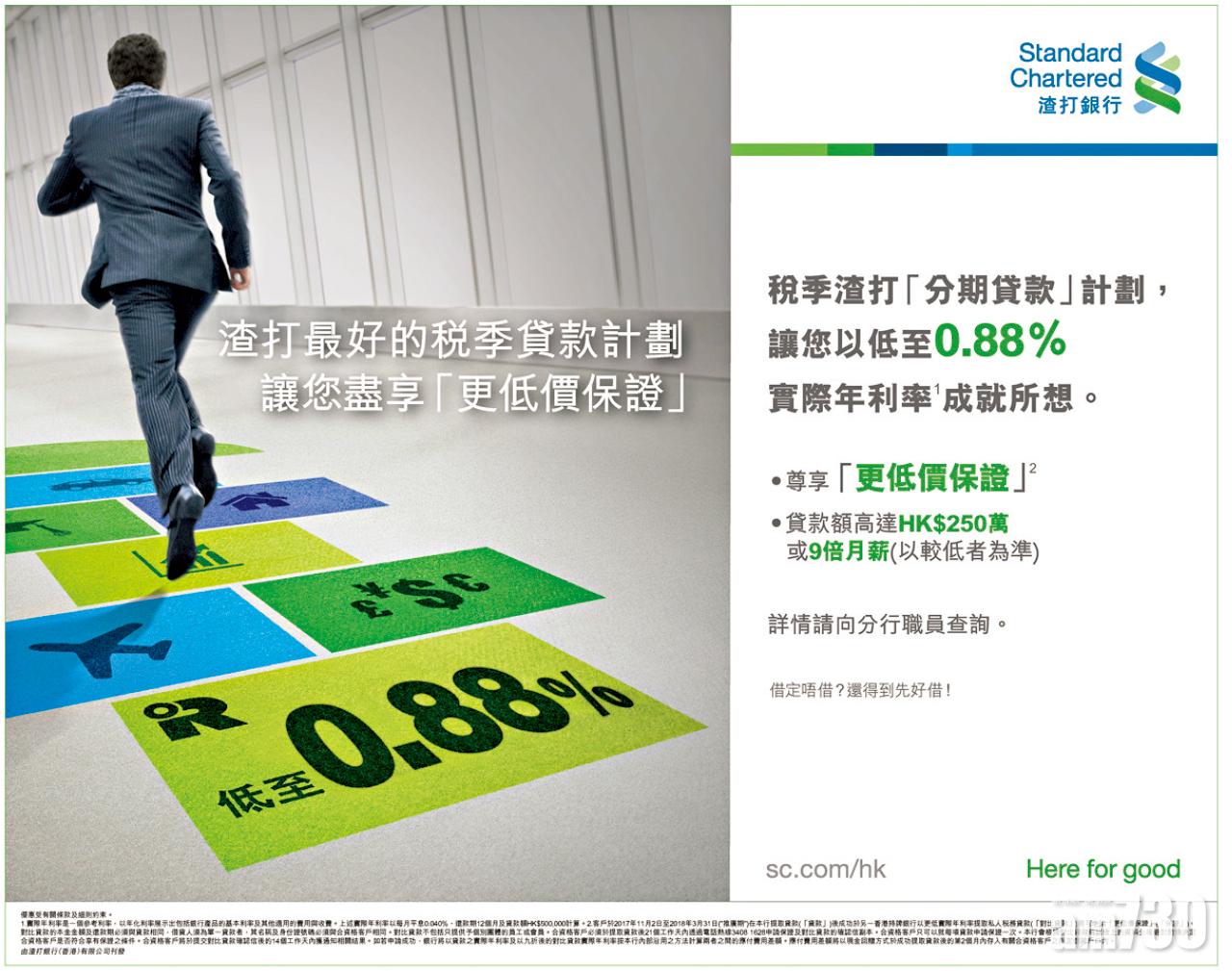 稅季已至,各銀行紛紛推出稅貸計劃,為助客戶以低成本提取資金實現大計,渣打銀行的稅季分期貸款,推出實際年利率低至0.88%的優惠,更設有「更低價保證」,保證客戶可享更低利率。