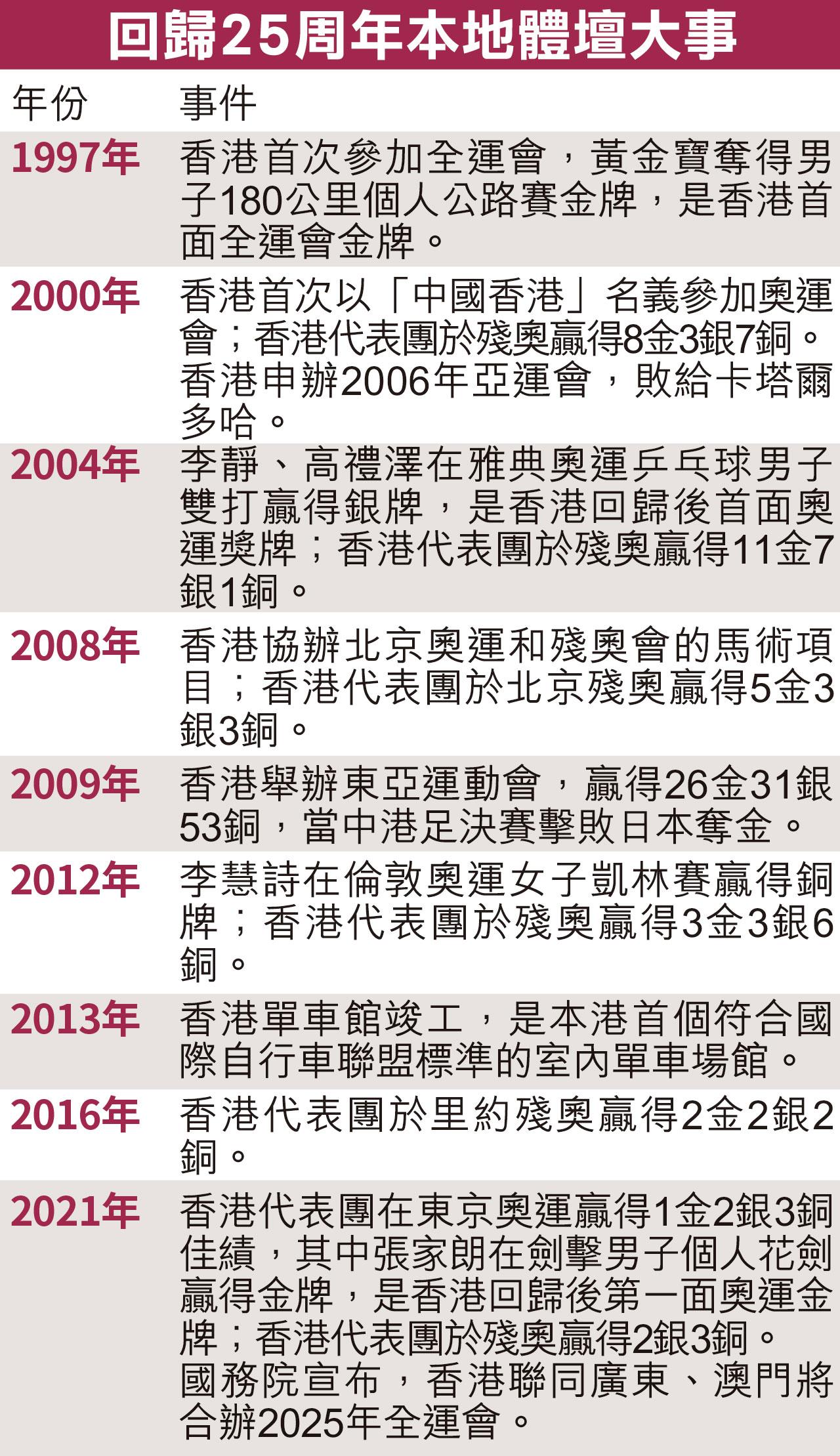 他亦指,回歸以來,香港運動員與內地運動員交流愈見緊密,內地運動員、教練和相關輔助人員來港服務亦大大提升香港運動員技術和競賽水平,不少香港運動員在內地集訓,並可與國家隊交流學習,「國家支持亦是港隊一大優勢」。