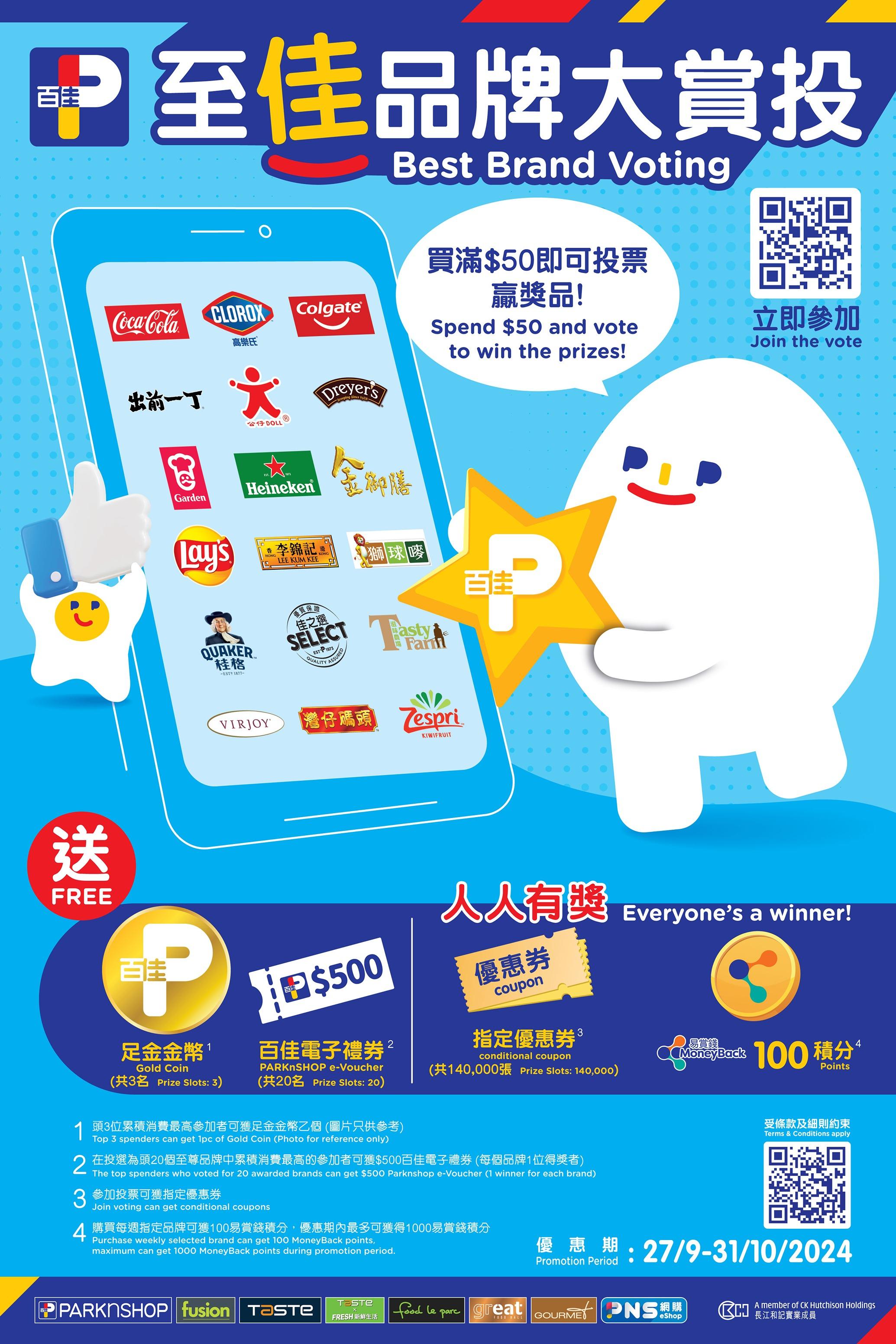 百佳舉行「至佳品牌大賞投」,派獎品人人有份,更有足金金幣送!由即日起至2024年10 月 31 日期間,易賞錢會員只要於全線香港百佳門市或百佳網店單次購買滿$50 或以上,憑有效收據正本或電子收據截圖,登入promotion.pns.hk登記,即可從候選品牌中分別投選10 個百佳「至尊超市品牌」及 10 個「至尊家庭品牌」,以行動支持心中最佳品牌。完成投票後,即可獲得指定電子優惠券1張(共140,000份)。購買每周指定品牌之貨品,並完成登記及投票,更可額外獲得100分易賞錢積分,人人有獎,永不落空,即買、即投、即賞!