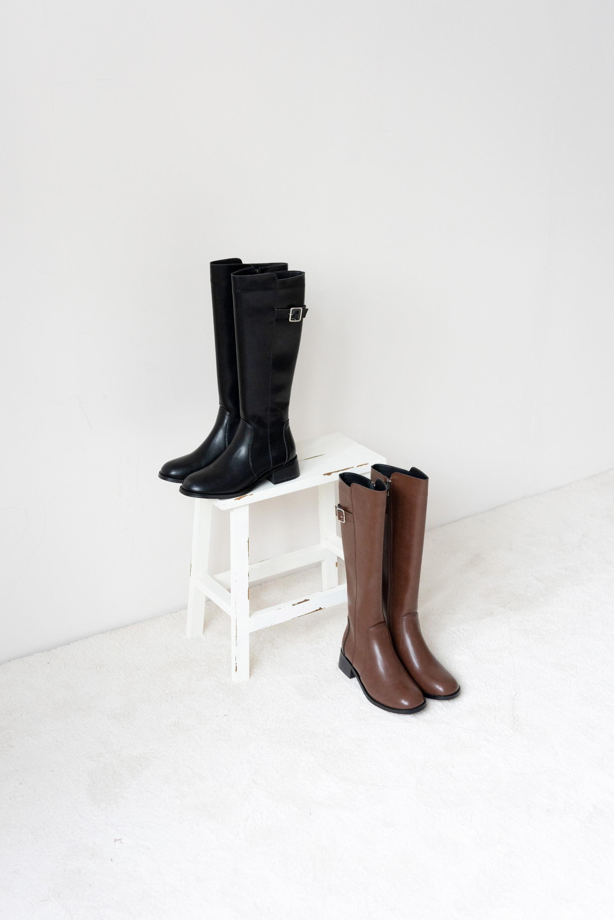 備有黑及啡色選擇,經典圓頭鞋頭設計歷久不衰。款式以及膝長Boots為設計理念,長度剛好包著小腿,展現修長美腿。鞋側以扣帶作點綴,增加英倫風格。