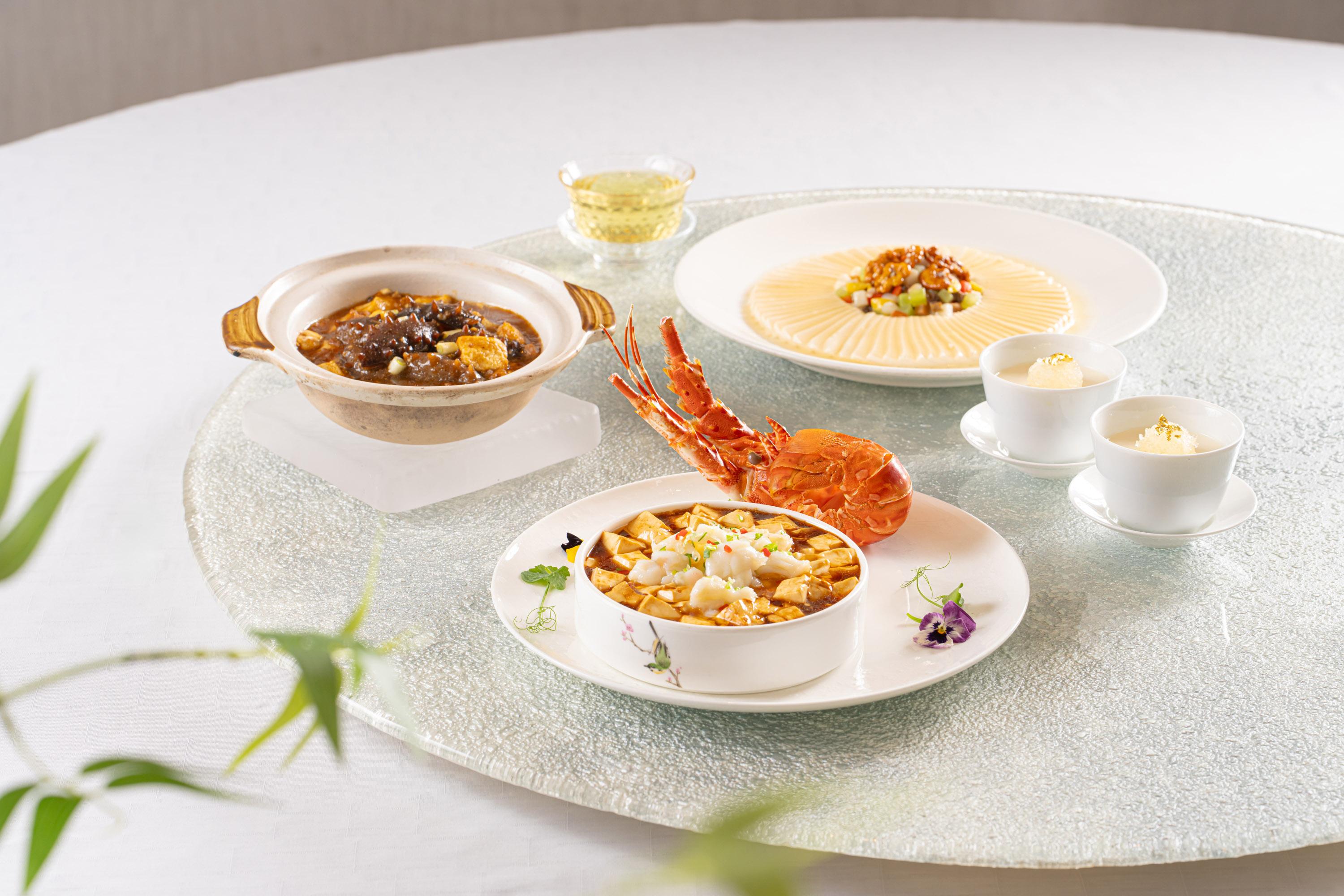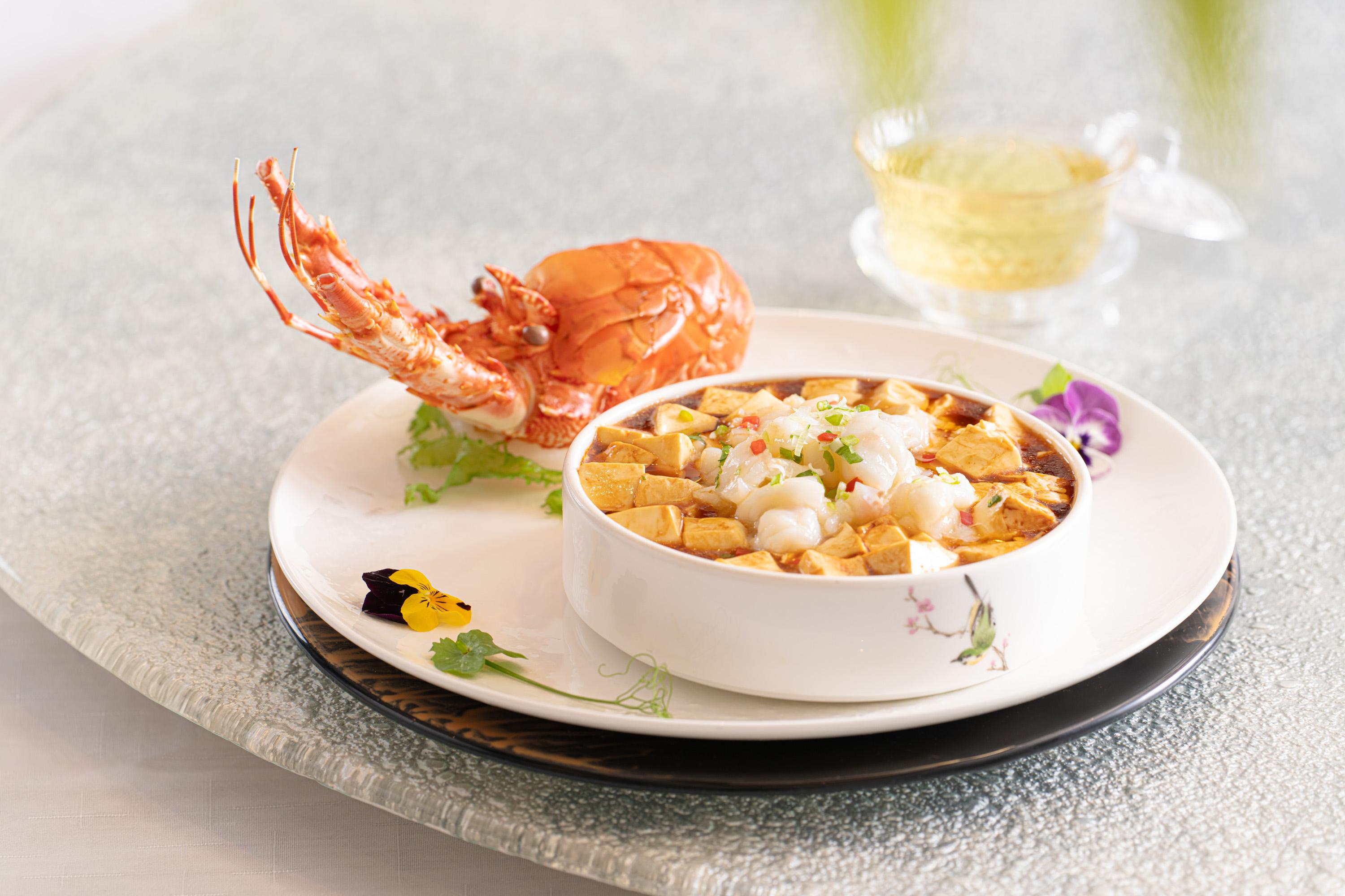 當中必試本地龍蝦麻婆豆腐($438),選用新鮮本地青龍蝦配搭經典麻婆豆腐,醇厚的豆瓣醬與微辣的調味料相互交融,打造出獨特的粵式風味。鮮爽的龍蝦肉,以少許花椒油炒香,讓麻婆豆婆添上一抹誘人的麻香。關東刺參馬友豆腐煲($698)則用料矜貴,以日本關東刺參配豆腐紅燒,加入少許梅香馬友鹹魚昇華味道,鮮美鹹香,絕對是冬日必食的煲仔小菜。還有極巧刀工的琥珀千葉豆腐($258),廚師將公和荳品廠出品的招牌滑嫩豆腐,巧手細切成2毫米厚度的薄片,並精心盤於碟中,搭配炒香的雞頭米、萵筍粒、馬蹄粒、榆耳以及羊肚菌等素食材料,綴以香脆琥珀合桃,精緻而美味。最後甜品則有燕窩豆腐奶凍($88),以豆香清冽的無糖淡豆漿配忌廉製成的豆腐奶凍,綴以燕窩和金箔,香甜幼滑,完美為「豆韻飄香」嚐味菜單作結。