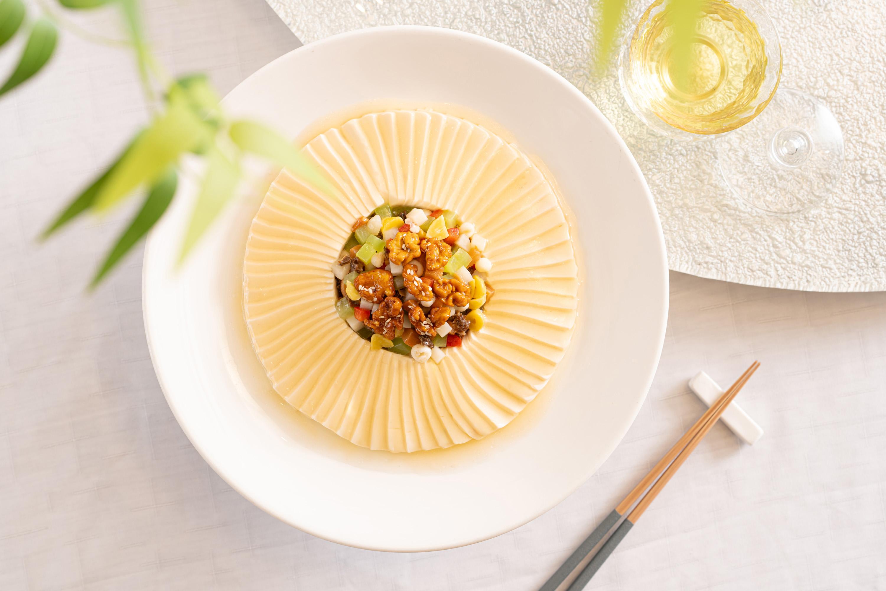 「公和荳品廠」創立於1893年,逾百年都以傳統工藝手法製荳,香滑的豆腐與滑嫩細緻的豆腐花多年來深受食客所愛,近年還屢獲米芝蓮必比登推介,口碑有目共睹。而今次明閣所推出的「豆韻飄香」菜單,就由明閣及中廚部行政總廚李悅發師傅將本地鮮製的豆製品融入菜式,在傳統粵菜基礎上結合本地食材,炮製出一系列展現豆香韻味的特色菜餚,同時推廣本地品牌與豆製品飲食文化。