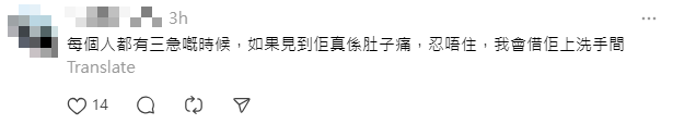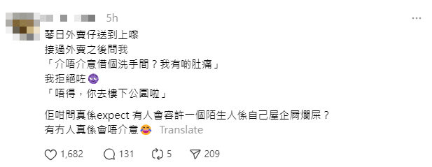 有網民在Threads發問,表示外賣員送到外賣後問「介唔介意借個洗手間?我有啲肚痛」。但網民較難接受有陌生人在自己家中解決大事,所以直言「唔得,你去樓下公園啦」。事後在網上分享經歷,吸引不少人留言。