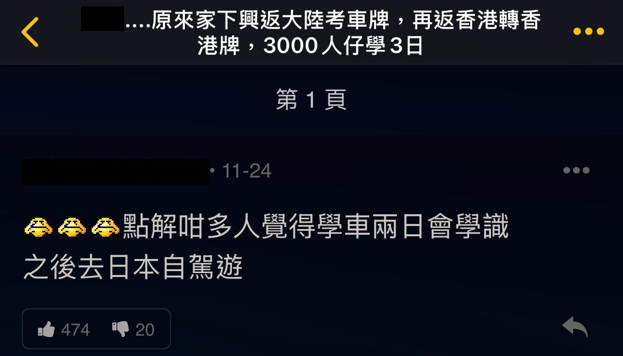 該名網民表示,現時不少港人都會在假期時北上深圳,逗留3天去學車,全程學費低至3,000人民幣,又揚言只需3日就能成功取得駕駛執照,「返大陸考車牌,再返香港轉香港牌,3000人仔學3日」。此外,網民更藉此力數留港考車牌的3大缺點,直言「香港學車、考車時間長」、「學費、租車費用昂貴」以及「教學質素差」。