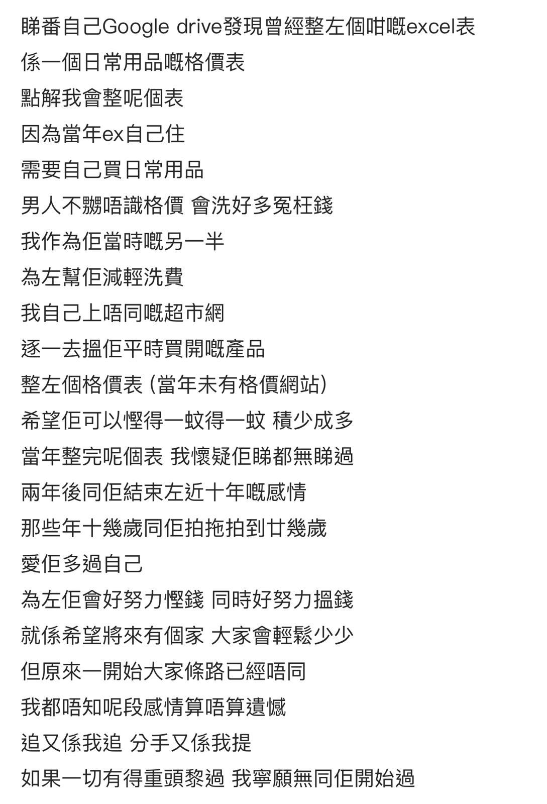 早前一位港女在討論區以婉惜語氣發文,指自己與前男友分手後,始驚覺自己一直以來「真係好傻」。她表示前男友因為自己住,需要自行購買日用品,而她認為「男人不嬲唔識格價,會洗好多冤枉錢」,因此「作為佢當時嘅另一半」、「為左幫佢減輕洗費,我自己上唔同嘅超市網,逐一去搵佢平時買開嘅產品,整左個格價表」,目的全為「希望佢可以慳得一蚊得一蚊,積少成多」。