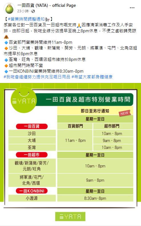 一田宣布,因應清潔消毒工作及人手安排,即日起各分店營業時間將會作出更改,超市開門時間不變,但全線分店提早至晚上8時休息。
