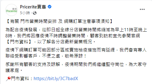 百佳表示,考慮到現時疫情嚴峻,為平衡員工及顧客安全,繼續為顧客提供服務,即日起調整全線百佳營業時間,部分分店會於下午3時關門。