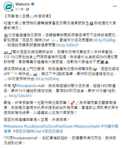 屈臣氏表示,店舖營業時間或根據疫情而不定時或有更改,顧客可透過「屈臣氏 隨時Chat」直接向分店店長查詢 bit.ly/35jABgj 。