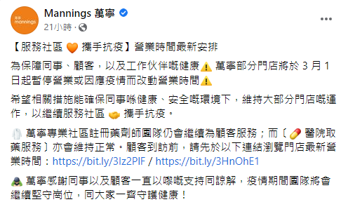萬寧表示,為保障同事、顧客,以及工作伙伴健康,部分門店將於即日起暫停營業,或因應疫情而改動營業時間。