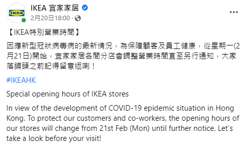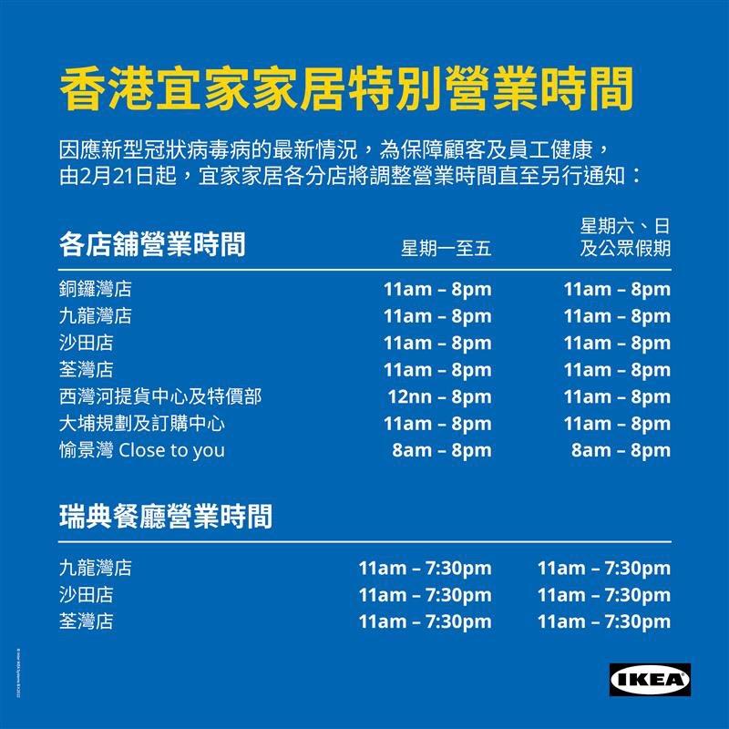 為保障顧客及員工健康,IKEA會因應新型冠狀病毒病的最新情況,調整營業時間直至另行通知。