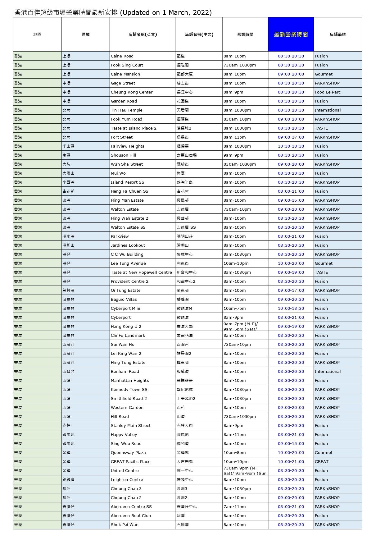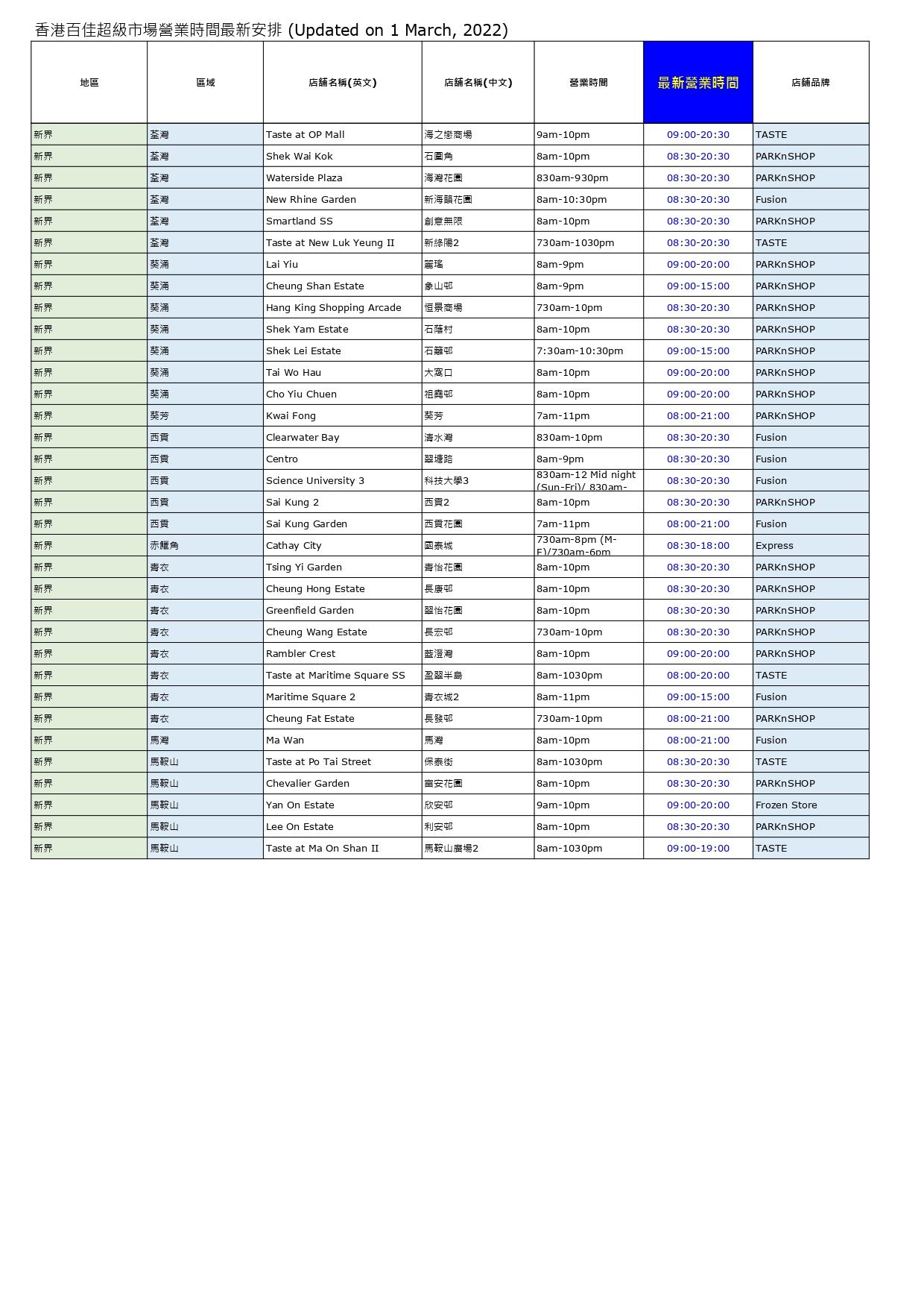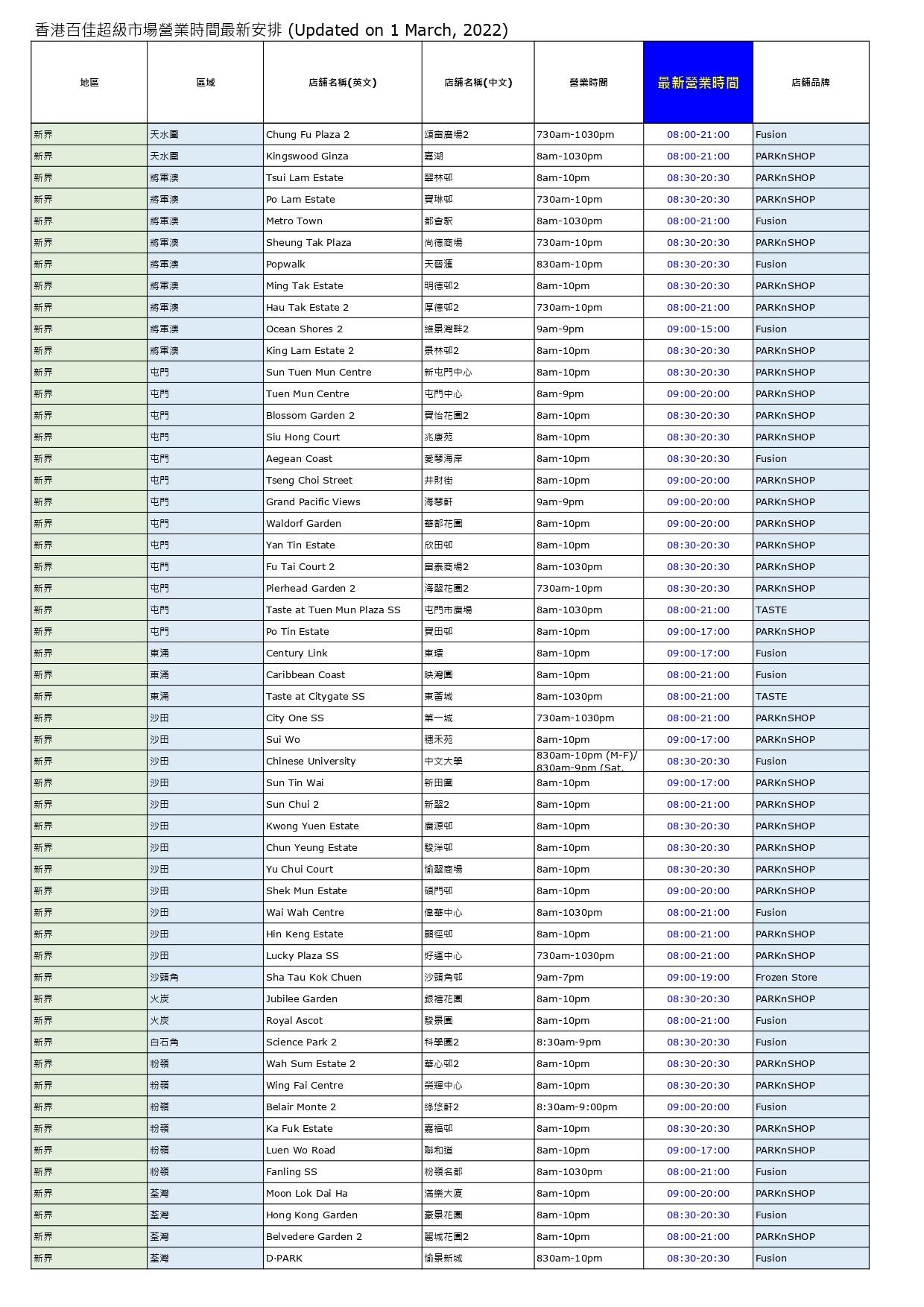 - 沙田、大埔、觀塘、新蒲崗、葵芳、元朗、將軍澳、屯門、北角店超市提早於8pm休息