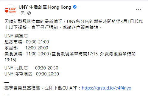 UNY生活創庫在Facebook宣布,調整樂富店、元朗店及將軍澳店的營業時間,最早於8時關門。