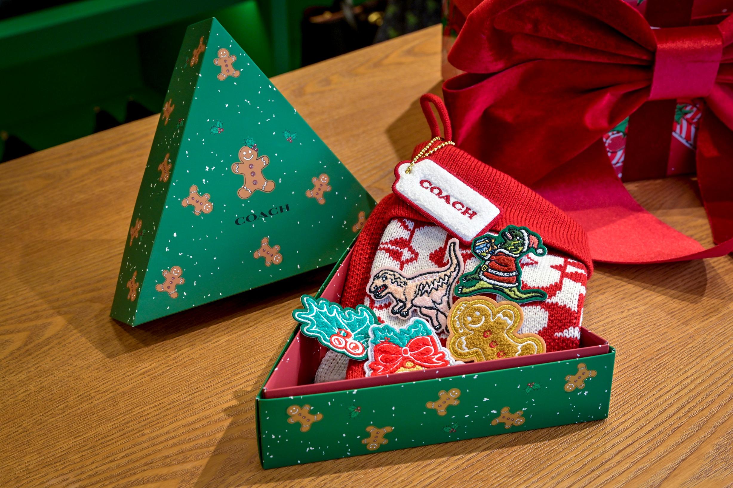 聖誕期間限定店有首棵COACH 聖誕樹外,更有一系列聖誕特別版Rexy禮品。凡於COACH期間限定店購物,店舖除提供禮物包裝服務,更會送上聖誕襪DIY禮盒,讓顧客可以把聖誕刺綉徽章貼在COACH聖誕襪上,發揮創意,創造出屬於自己的聖誕襪。