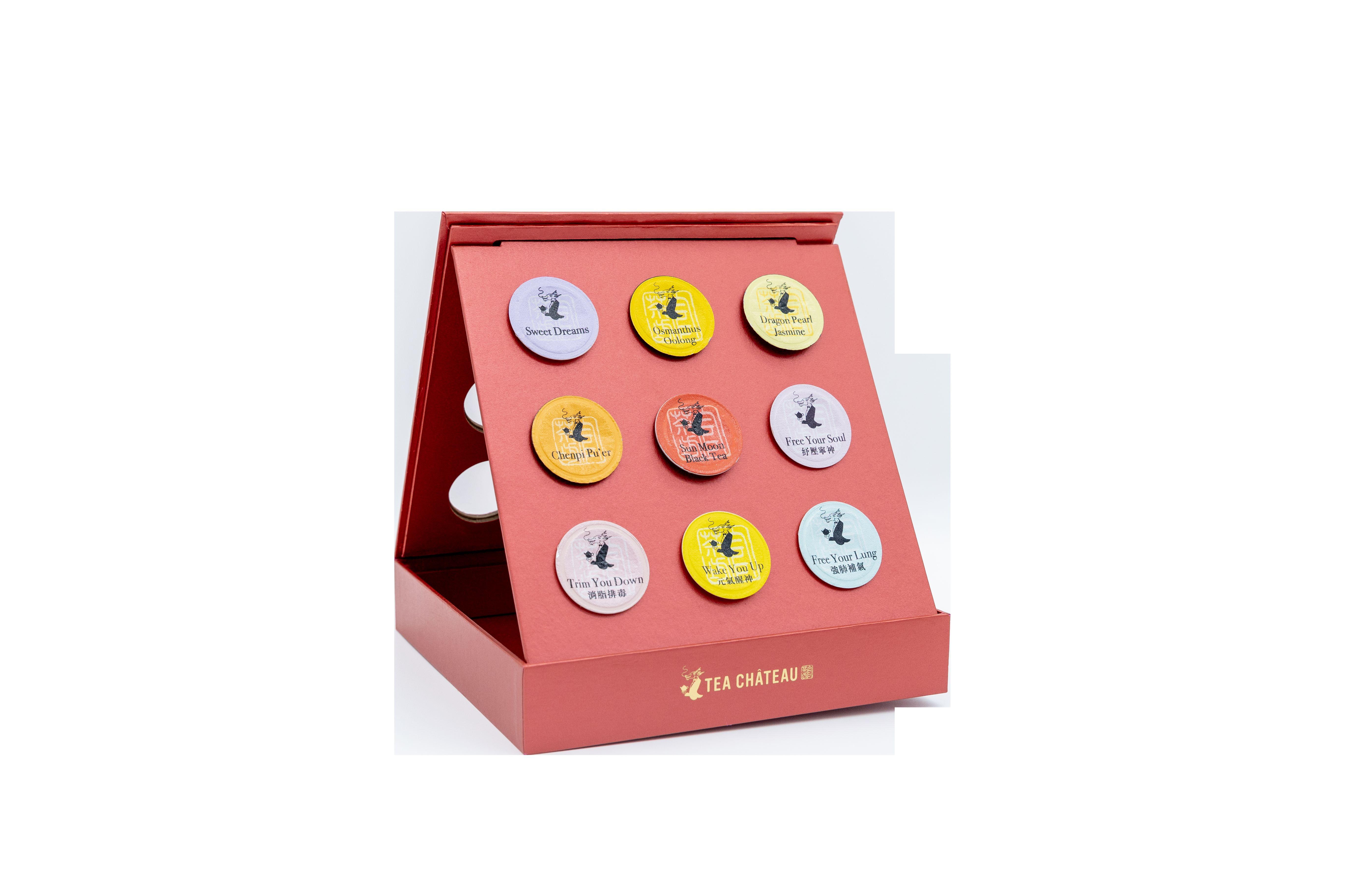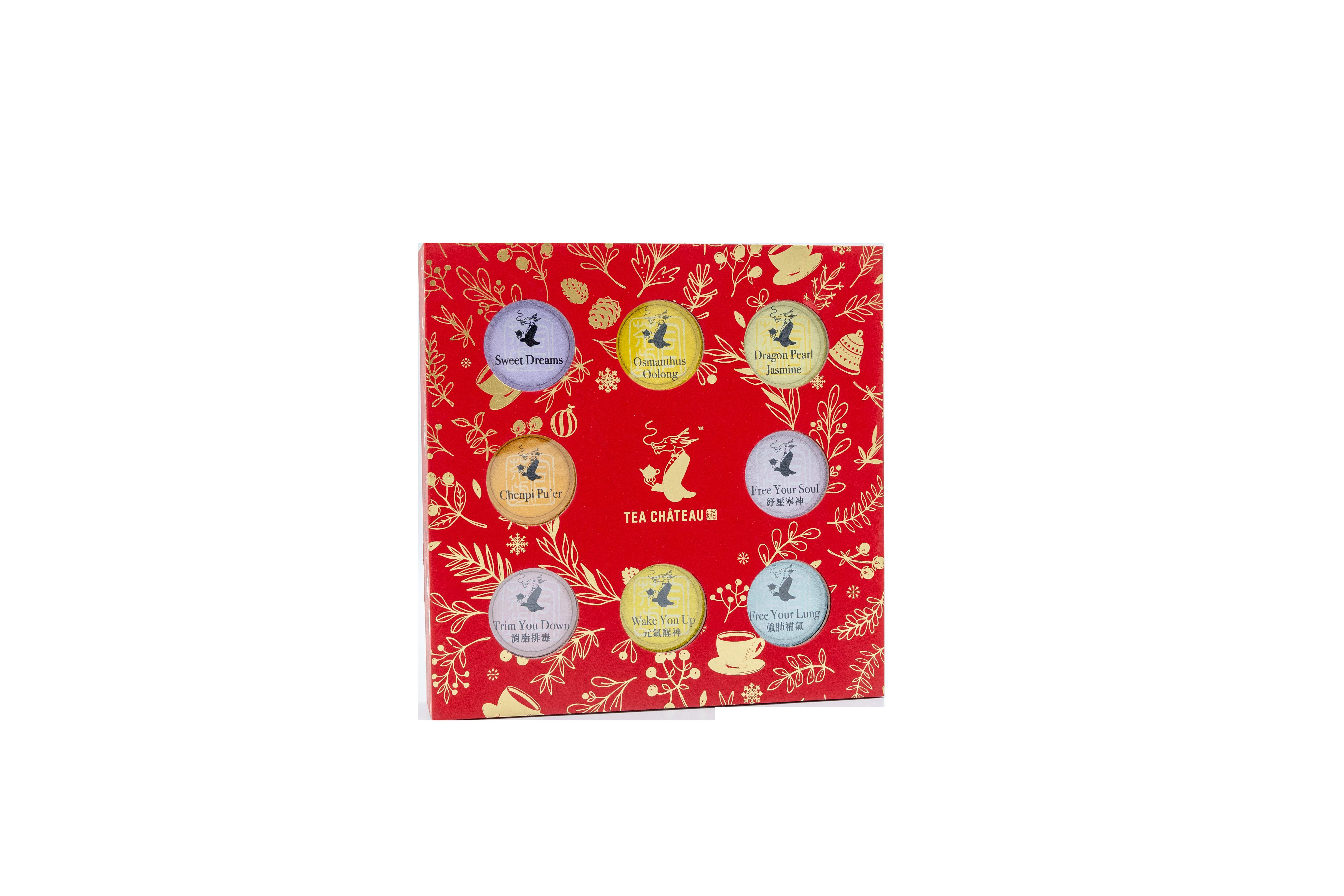 TEA CHÂTEAU 特別推出限量版聖誕茶架套裝,其中精選套裝包括 9 粒養生茶或 9 粒經典茶。 除了精選套裝外,門市亦提供自選配搭,可根據朋友的喜好及需要,挑選最適合的茶囊!茶架設計精美,正方形禮盒打開後可以變成樹形茶架,不僅可收納茶囊,亦可當裝飾品擺放。