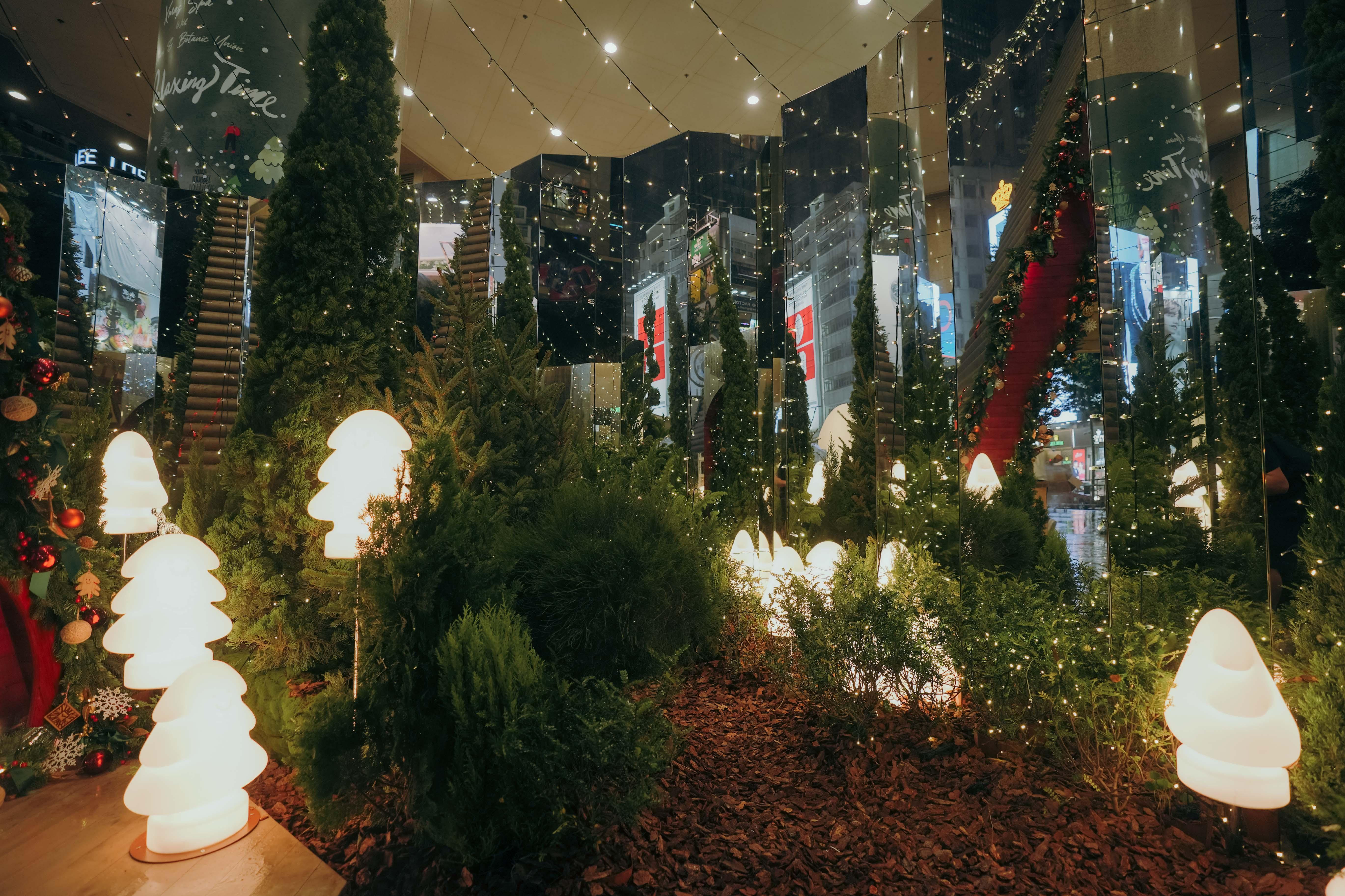 踏出木屋,近100棵不同高度及品種的真松樹映入眼簾,在多幅超過3米高鏡牆的多重反射之下,猶如置身於北歐聖誕森林。加上地面鋪滿松皮,讓大家在鬧市中也能感受到大自然療愈的威力。