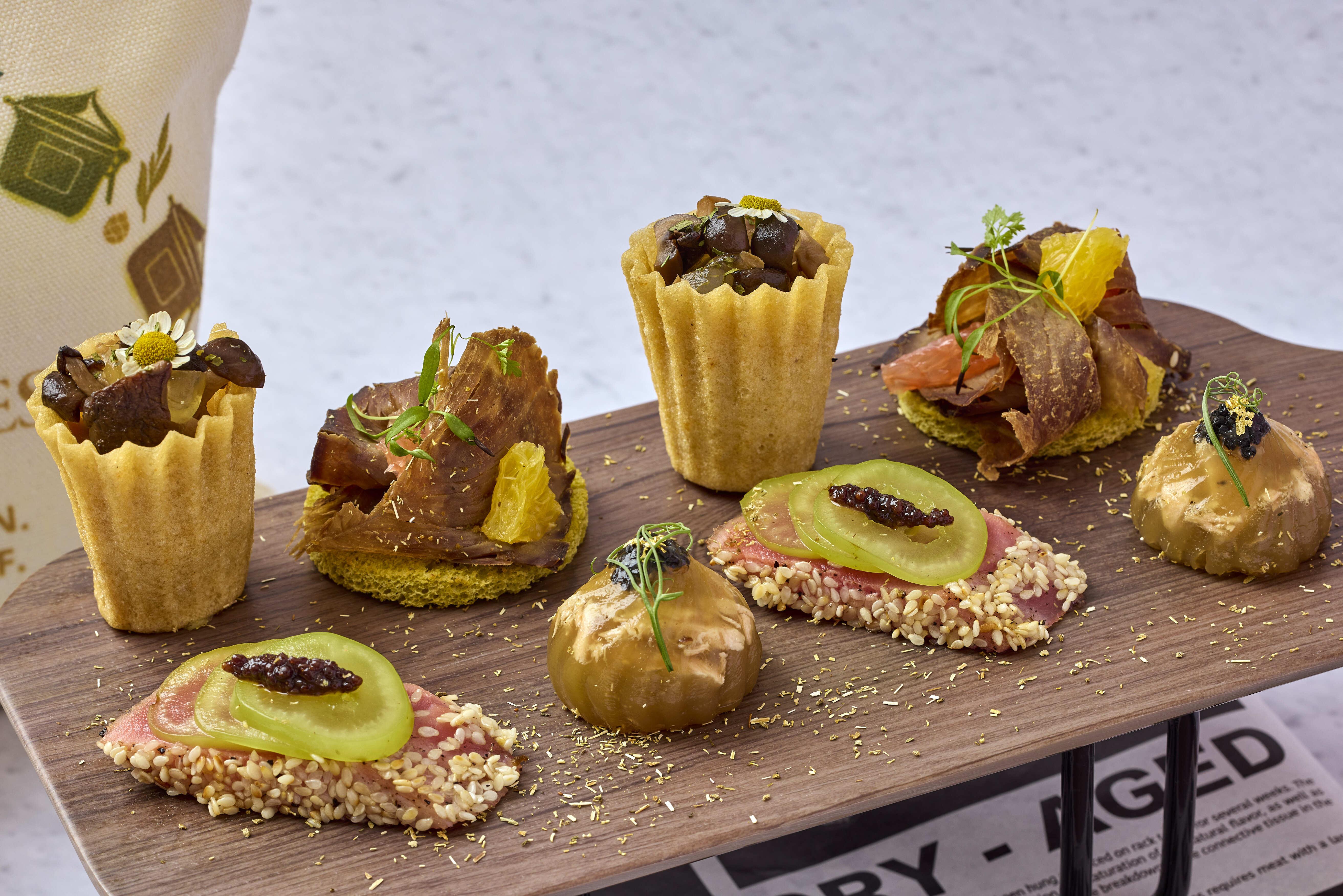 「Dolce Far Niente幸福之門」聖誕下午茶的創作靈感來自於BORGHESE全新 Dolce Far Niente幸福之門佳節系列中皇牌泥漿的成分,如柑橘、洋甘菊、蜂蜜、蘆薈,並結合多款高貴營養的食材,如三文魚、魚子醬、松露、白桃等,展現了由內而外的全面淨化,帶來源源不斷的身心寵愛和抗氧化。鹹點精選中,首先是「油浸三文魚配魚子醬凍批」,特別製作的水滴狀啫喱湯凍中富含豐富的膠原蛋白,滋養肌膚;廚師團隊選用大量豬骨,以高溫和長時間的燉煮,製作出濃郁的口感和彈性十足的啫喱,內裡夾雜著油浸三文魚,營養豐富,再以魚子醬點綴,更顯奢華。其他精緻鹹點均選用時令優質食材,如「柑橘鴨胸開面三明治」,嫩滑的鴨胸肉搭配柑橘醬,為三明治增添酸甜清新的開胃風味;「芝麻烤鮪魚配葡萄芥末籽醬」外觀誘人,鮪魚均勻包裹著一層芝麻,肉質豐厚,營養豐富,經過煎烤後香氣四溢;還有小巧別致的「熱蘑菇撻配蘆薈和蜂蜜洋甘菊」,香脆的小金杯中盛載着熱騰騰的炒蘑菇,與蘆薈和蜂蜜醬相結合,風味獨特。
