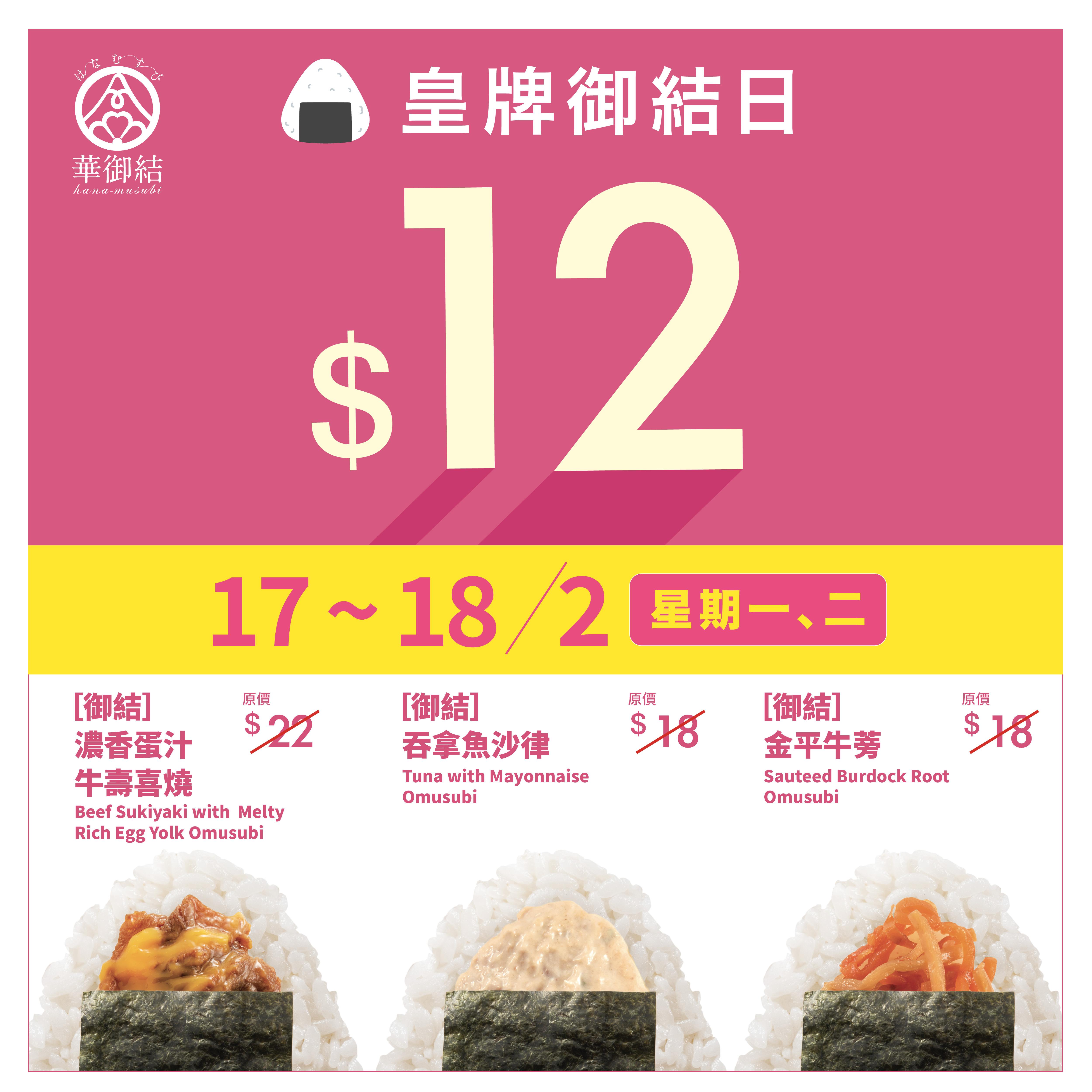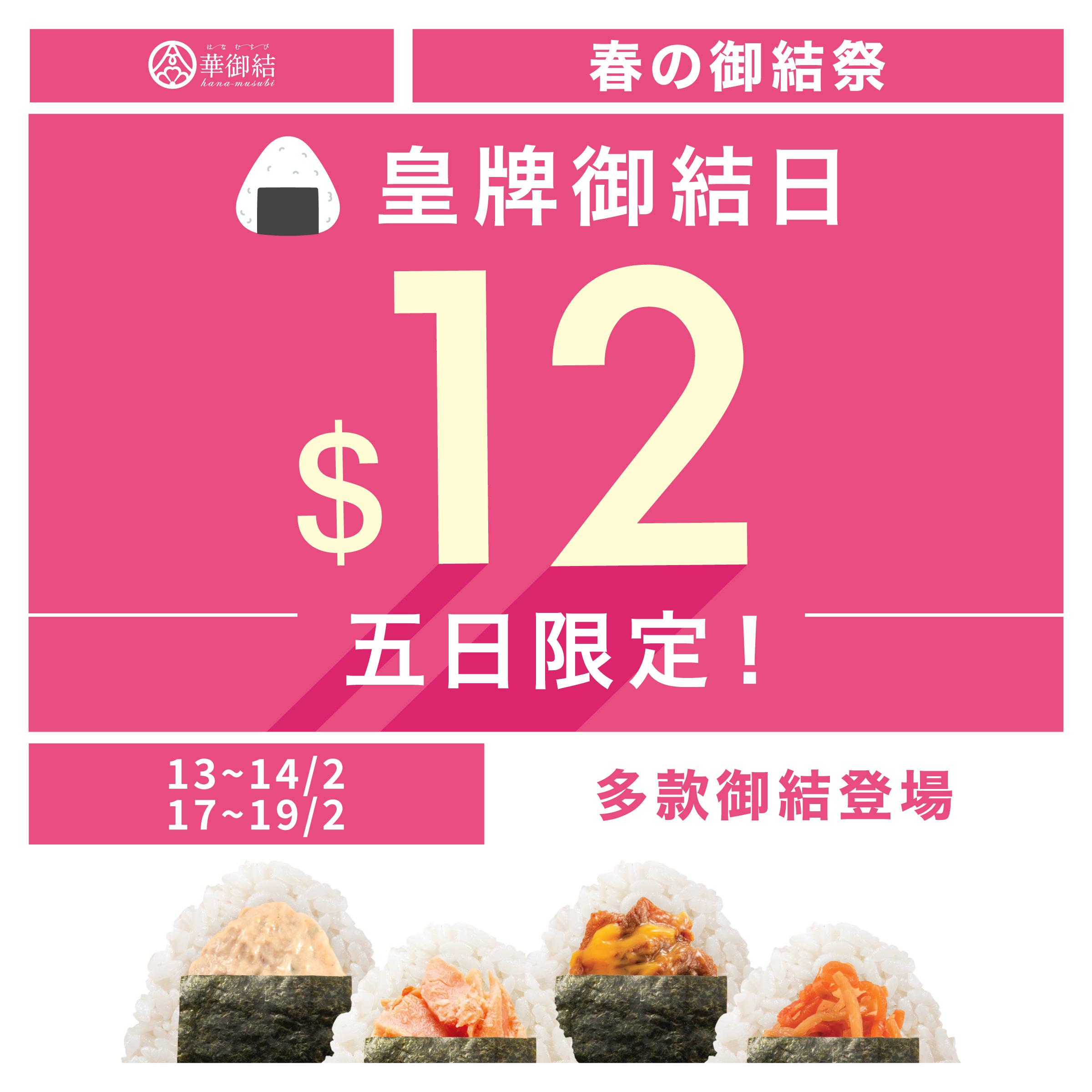 各位上班族學生哥福音!華御結由2月13日至19日推出「皇牌御結日」,逢星期一至五,多款御結以春日至抵價$12發售,優惠限定5天。口味包括北海道產秋鮭三文魚(原價 $20)、濃香蛋汁牛壽喜燒(原價 $22)、紅雪蟹沙律(原價 $20)、辛口明太子(原價 $19)及素食御結金平牛蒡(原價 $18)等。是次優惠每人限購兩件,售完即止。