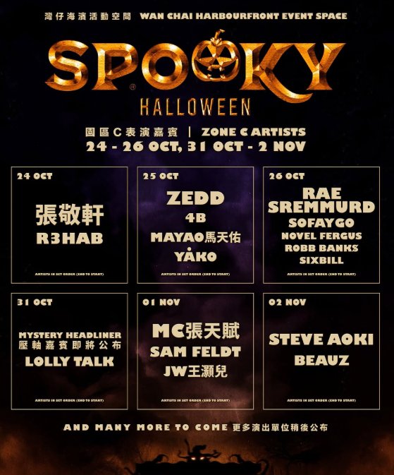 全港首個萬聖節音樂盛事SPOOKY Halloween登陸灣仔海濱活動空間!為期10日的萬聖節音樂嘉年華,融合音樂、文化與沉浸式體驗,約定市民於萬聖節盡情狂歡。國際級DJ Zedd、Steve Aoki、及香港歌手張敬軒、MC張天賦等逾20組藝人將輪番上陣,即睇詳情!