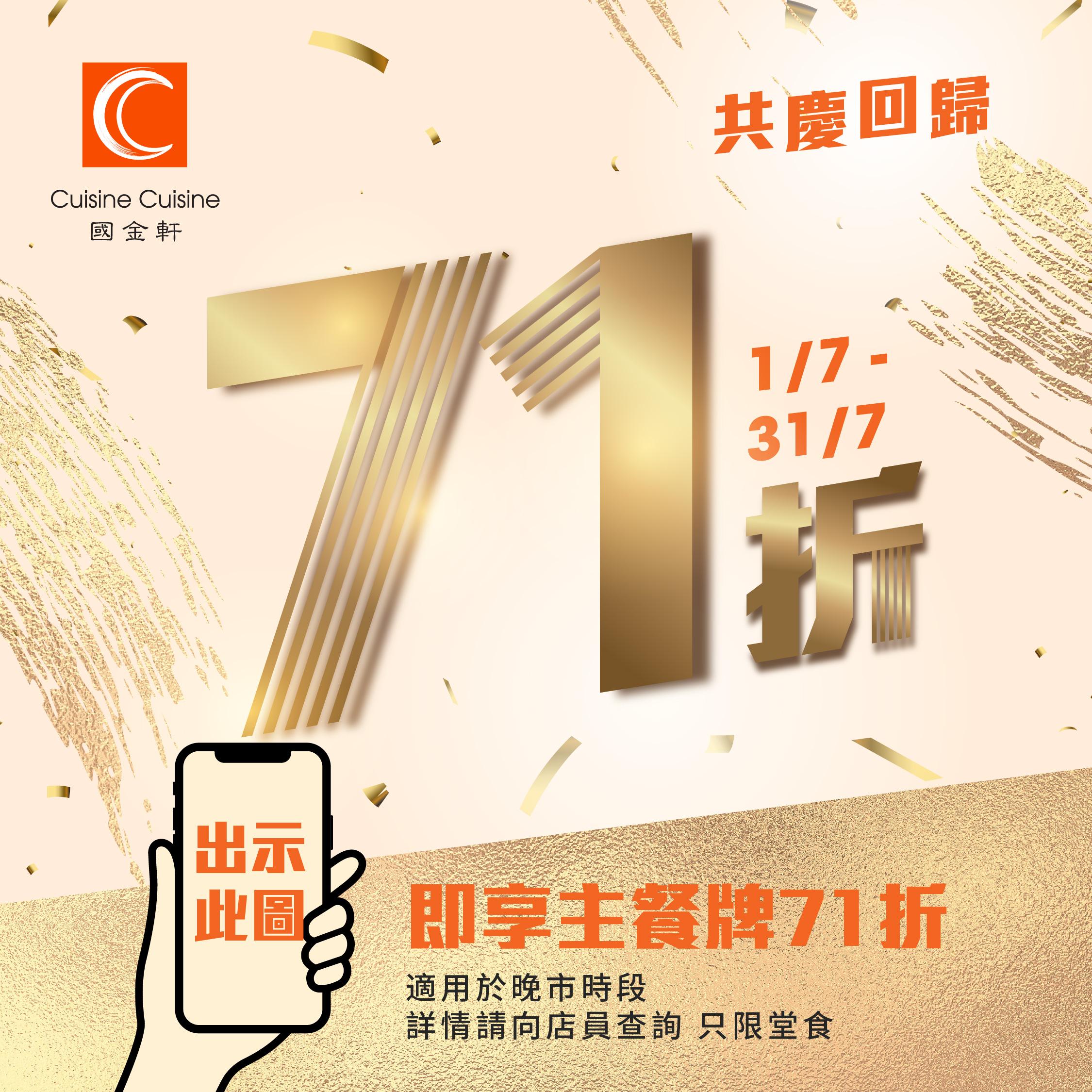 為慶祝香港回歸祖國28週年,由即日起至7月31日,於星期一至日晚市時段惠顧國金並出示以下圖像,即可尊享主餐牌71折優惠;同時更可品嚐十款殿堂級粵式美饌低至7折優惠 (優惠不得同時使用)。