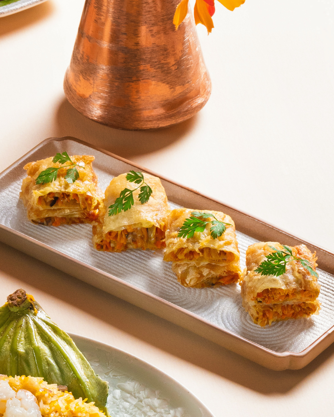 國金軒「粵韻素珍養生宴」以健康為本,精選被譽為菌中之王的雲南頂級野生松茸與白舞茸菌,打造令人驚艷的素食體驗!招牌「香煎如來素鵝」將腐皮層層酥煎至金黃脆香,內裹菌香綿密的鮮美口感;「松茸野菌餃」晶瑩剔透,輕咬即釋放松茸與野菌的濃郁鮮韻;「羅漢石榴菓」復刻傳統石榴雞工藝,小包子內藏羅漢齋,形似綻放石榴,展現素食的無限可能。原價每位港幣528元,現於Mira eShop預訂,尊享免加一服務費及茶芥優惠,有興趣的話一於預早訂座!