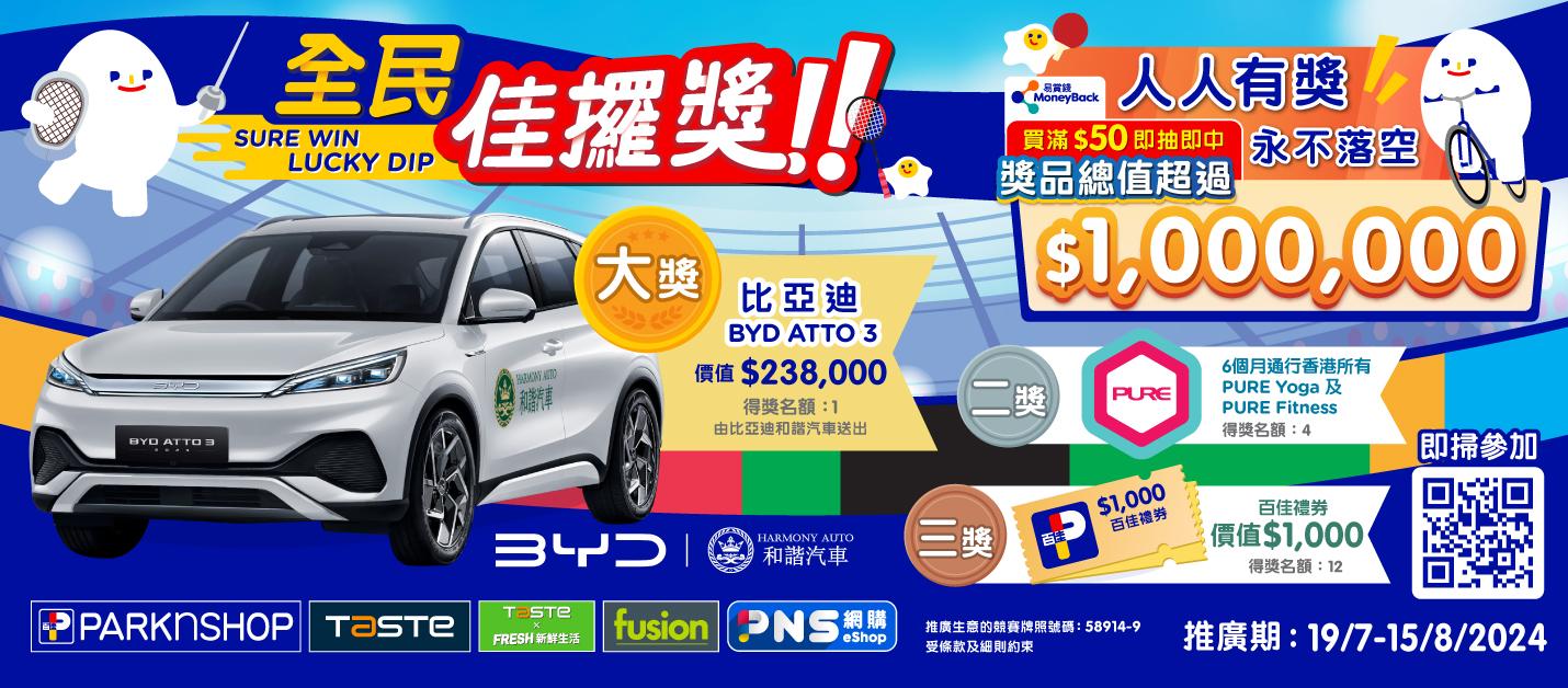 百佳「全民佳攞獎」獎品總值超過$100萬,其中大獎比亞迪ATTO 3汽車 (價值 $238,000) (共1份)、二獎6個月通行香港所有PURE Yoga及PURE Fitness (價值 $13,794) (共4份)、三獎百佳禮券 (價值 $1,000) (共12份) 等,總共準備了超過20萬份獎品,保證人人即抽即中!