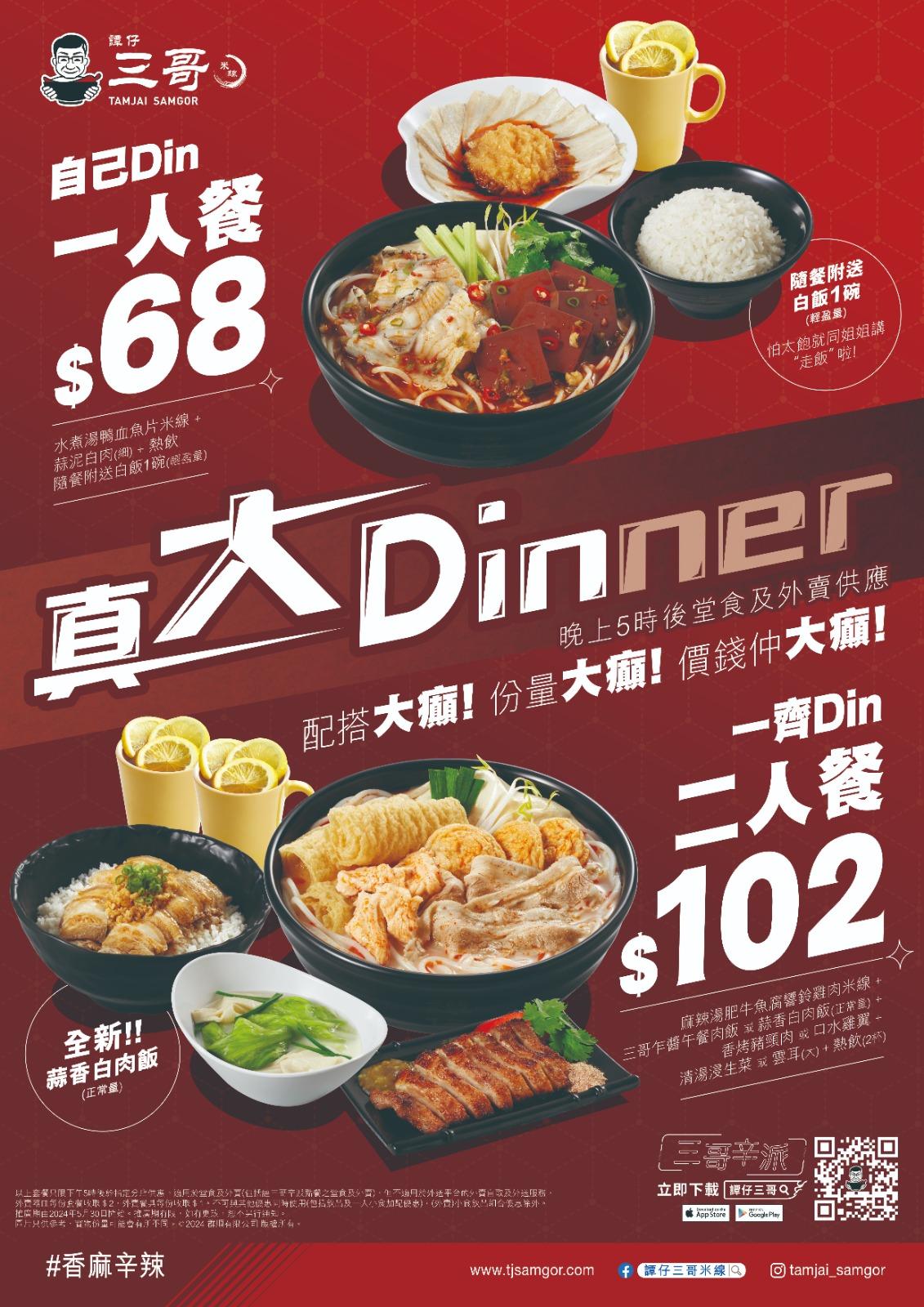 譚仔三哥由 5 月 30 日起推出的「真 ‧ 大 DINner」晚市套餐,每日下午 5 時後供應;一人套餐以三哥 自家獨創的「水煮湯鴨血魚片米線」為主打,二人套餐則提供「麻辣湯肥牛魚腐響鈴雞肉米線」,加 上全新推出的「三哥乍醬午餐肉飯」或「蒜香白肉飯」二選其一,兩款套餐同樣配搭小食和熱飲。