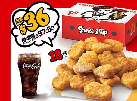 Shake & Dip 系列優惠來到倒數階段,大家切勿錯過金黃酥脆的麥樂雞配特色滋味醬!全新「$36 歎 18 件麥樂雞配飲品」或「18 件麥樂雞套餐減$5」優惠,一次過能夠嚐盡「蒜辣蛋黃醬」、「煙燻芝士醬」、「香草檸檬醬」及「蜜糖芥末醬」4 款期間限定滋味醬!今星期更推出二人套餐,優惠「 $88 歎 18 件麥樂雞配 2 杯中汽水 2 份中薯條 2 個酥皮朱古力批」,份量多,適合與親朋好友一齊share。而「$29 歎 6 件麥樂雞套餐」亦繼續供應,大家一於把握優惠機會!