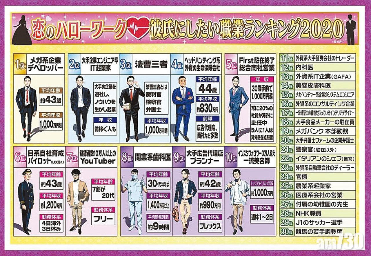 日本一綜藝節目日前以「理想男友職業」為名,訪問了百多名女性,結果仍是「高薪是重點」!