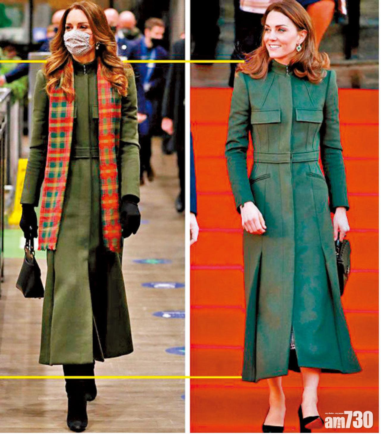 凱特周一以愛牌Alexander McQueen長軍褸亮相,該外套已在年初於Bradford出席活動時穿過,凱特今次加了一條紅綠格子圍巾,感覺已截然不同。