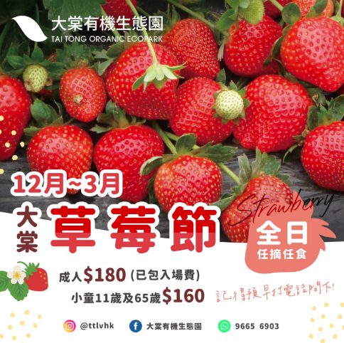 大棠有機生態園舉辦大棠草莓節,最平只需$160即可任摘任食園内種植的士多啤梨,滿足各位士多啤梨迷的胃。園内設有其他打卡及娛樂設施,摘完士多啤梨後亦可在園內玩足一日。