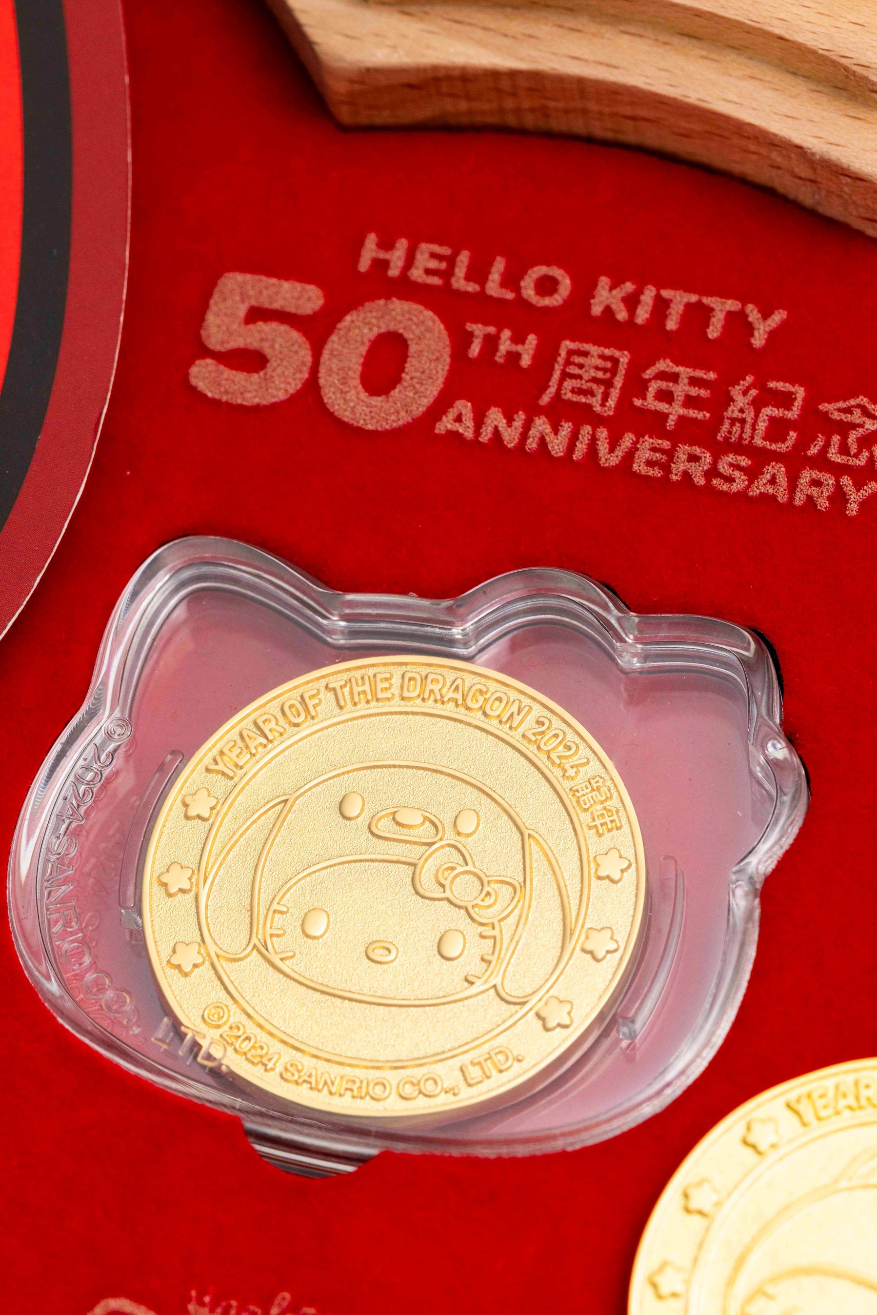 今次慶典特別推出Hello Kitty 限量版50周年十二生肖紀念金幣及珍藏木盒套裝,每枚金幣展現不同生肖面貌,融合Hello Kitty與中國傳統文化元素。套裝全球限量發售500套,以Hello Kitty巨型蝴蝶結形木盒包裝,盒面的紅色蝴蝶結上隱藏著「50」這個數字,盒內也刻製上Hello Kitty 50周年標誌,盛載著以Hello Kitty 形小盒個別包裝的12枚金幣。金幣亦有單枚版發售,Hello Kitty達摩頭上頂著一顆她喜愛的紅蘋果,肚子裏則收藏一枚生肖紀念金幣。紀念金幣即日起在海港城網上平台公開預售,數量有限,收藏價值極高,絕對是Hello Kitty 粉絲必不可少的珍藏品!