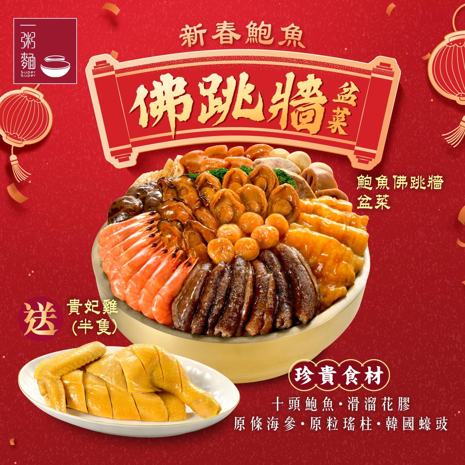 龍年將至,當然要和家人一起飽歎意頭盤菜!一粥麵推出新春鮑魚佛跳牆盆菜」及「五福臨門煲」,提供堂食和外賣選擇。「新春鮑魚佛跳牆盆菜」共15款食材,有齊十頭鮑魚、原粒瑤柱、原條海參、滑溜花膠、韓國蠔豉等豪華食材,更加送貴妃雞,6位用套餐更有紅燒花膠肉絲素翅(4磅)及糯米飯(2磅),份量相當足料!另外「五福臨門煲」套餐($198)則適合二人家庭享用,精選五款高級食材入饌,包括:滋補紅燒花膠、鮮味韓國蠔豉、古法扣鴨掌、肥美南乳豬手、蠔皇花菇等,套餐更有兩款配搭組合可供選擇,包括香脆黃金乳鴿及2碗香飯;或加配用料十足的揚州炒飯,另更可獲贈七師傅利是封乙套。