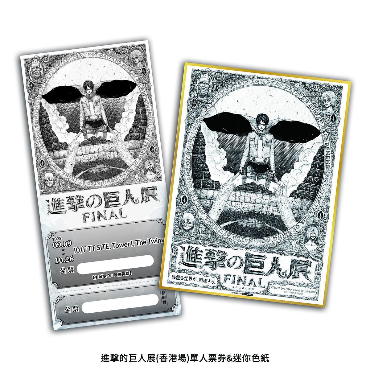 每位觀眾入場即可獲隨機款式禮物:原比例「珍藏複製手稿」一張,四款經典場景將隨機送出,分別為:艾連首次變身巨人揮拳爆發瞬間、兵長里維初登場銳不可擋的帥氣畫面、艾爾文團長率領調查兵團赴死衝鋒的壯烈時刻,以及米卡莎含淚道出「謝謝你替我圍上這條圍巾」的動人告白,每款都十分值得珍藏!