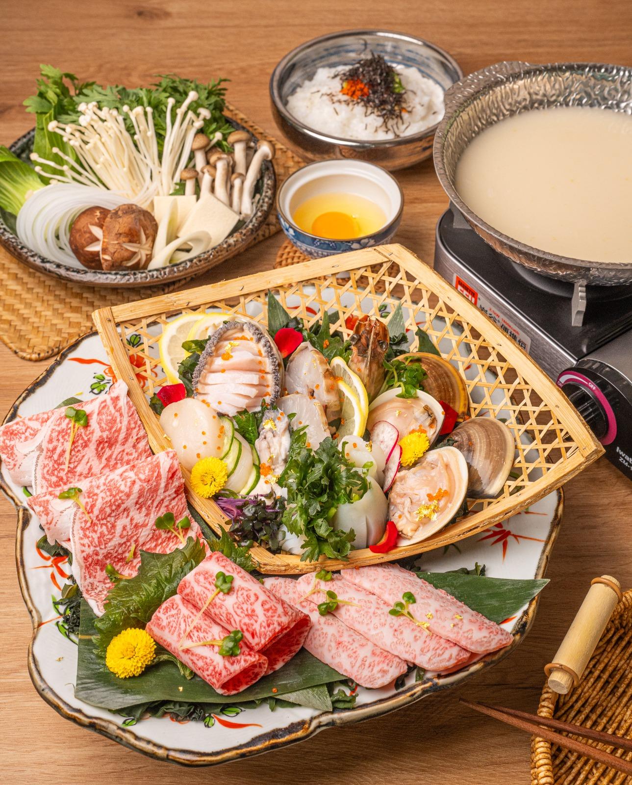 瀨尿蝦天婦羅 ($180) 嚴選東南亞瀨尿蝦,先拆殼起⾁再蒸熟,⽤紫蘇葉和紫菜卷起蝦⾁和蟹膏,包裹粉漿炸⾄薄脆,火候需拿捏恰到好處 ,⾁質爽彈、外脆內嫩,帶⼀絲海⽔鮮甜。日式串燒 ($40-$138) 「明道」提供多款特⾊⽇式串燒,包括 厚燒⽜舌、汁燒免治雞⾁棒、鹽燒百⾥香、汁燒雞頸⾁、鹽燒雞翼、鹽燒⽩鱔等。鍋物套餐「雅」 ($928) 食材搭配⼗分豐富,其中海鮮包括鮑⿂、虎蝦、帶⼦、⽣蠔、⽇本⼤蜆和紋甲魷⿂。另有油花分布均勻的A4⼭形和⽜⻄冷;⽜味濃郁、⾁汁豐富的佐賀和⽜⽜頸脊;⾁質細膩、油脂豐盈的⾶驒⽜肩⾁。套餐包含雜菜盛、稻庭烏冬或粥,共5款⾃家製湯底可選擇,其中推薦鮮濃鱲⿂湯,每⽇採⽤新鮮鱲⿂熬煮,鮮甜香濃,最後加入綿密⽩粥和⽇本九州蛋,融合食材之精華,讓味蕾體驗⼀場極致盛宴!