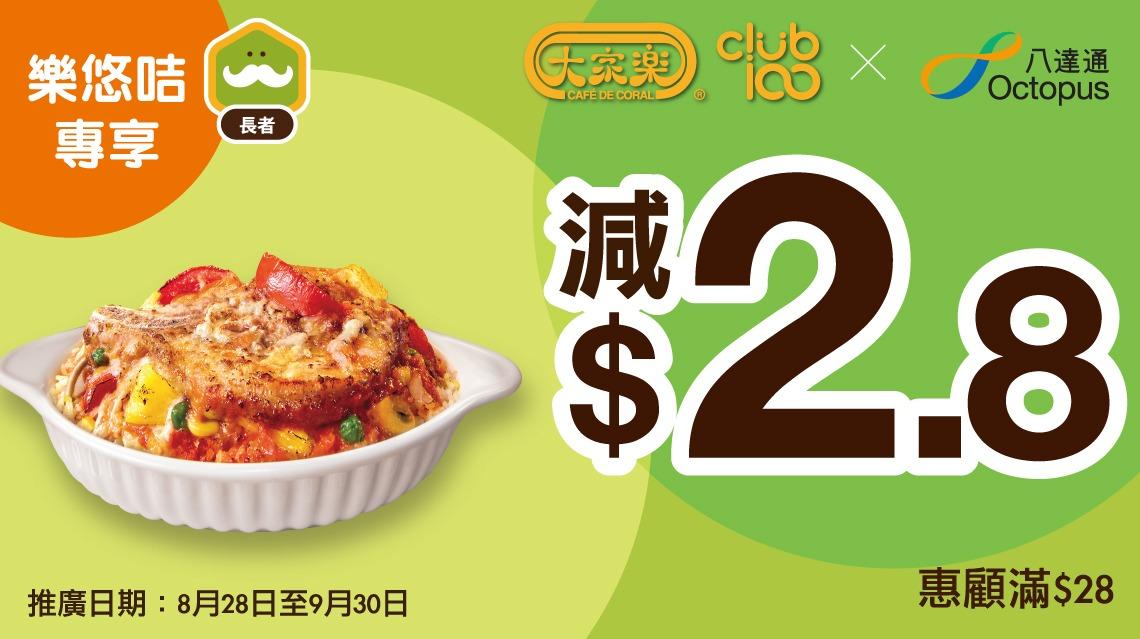 另外大家樂同步推出「樂悠咭專享」會員限定禮遇,由 8月28日至9月30日,長者會員只需要到大家樂以樂悠咭付款,即可享用至抵優惠,包括「$1 奶茶」、「$2.8 咖啡」、「減$2.8 優惠券」、「$28 樂悠茶餐」及「指定套餐減$8 優惠券」,長者會員記得唔好錯過!