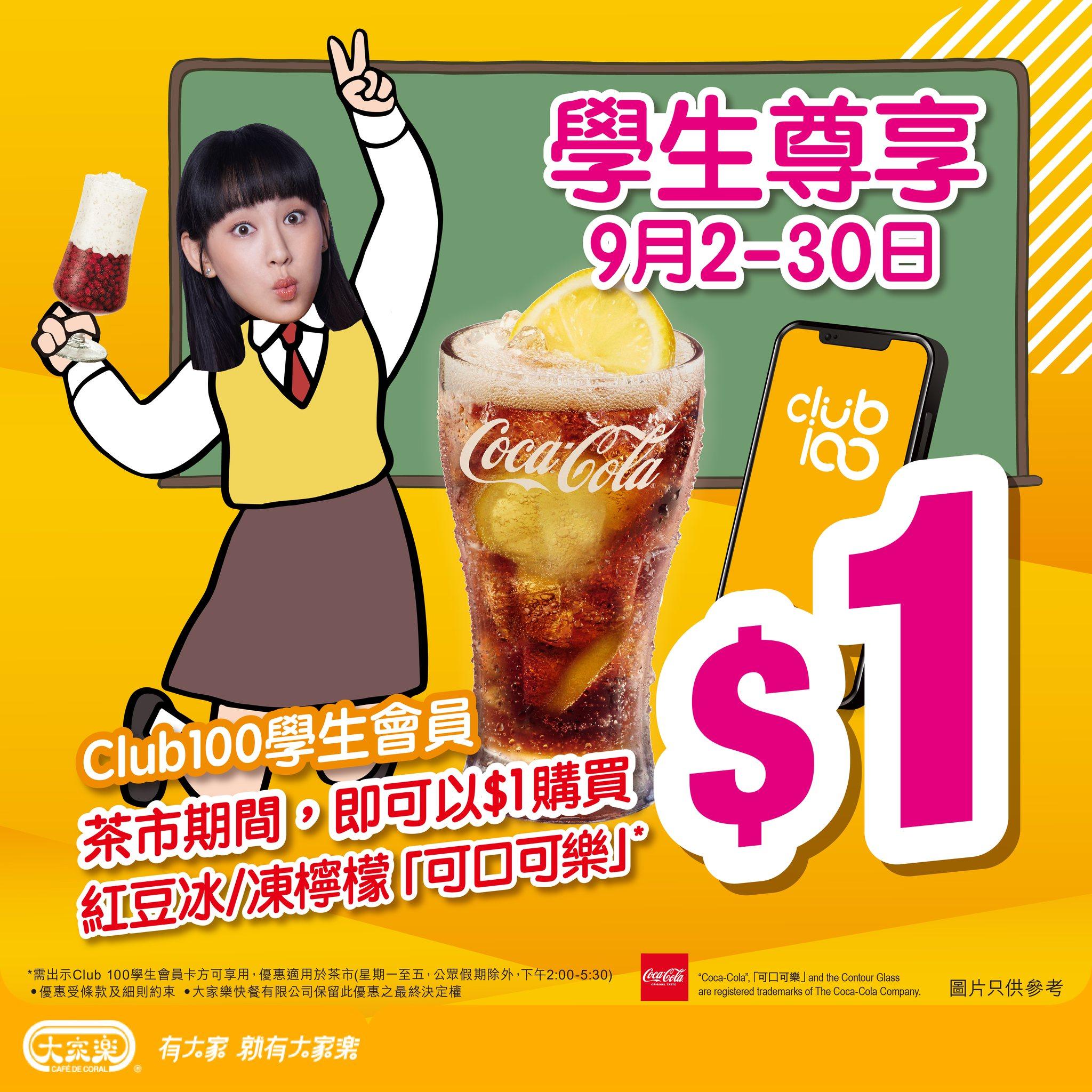 9月2日至30日期間,登記成為學生會員,可於全線分店逢星期一至五(星期六日、公眾假期除外),茶市期間,在收銀處出示Club 100學生會員卡,可享 $1 購買1杯紅豆冰 / 凍檸檬可口可樂 (12oz),以及免費送茶市雞翼一隻優惠。