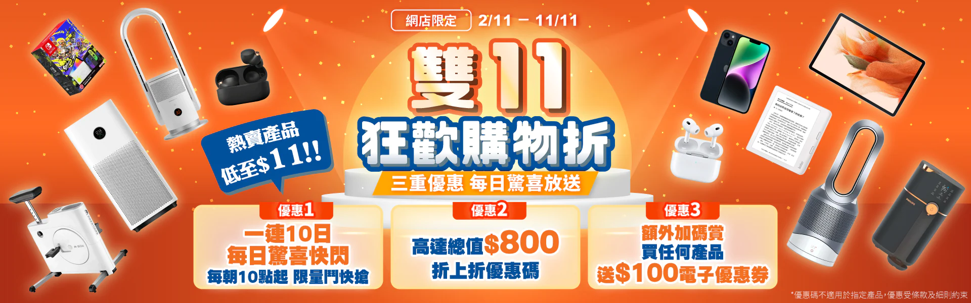 豐澤在官網舉行雙11優惠,由即日至11月11日,一連10天每日早上10點更新,每日都有不同主題,限量熱賣產品低至$11,購買任何產品送$100電子優惠券,並有高達總值$800折上折優惠碼。