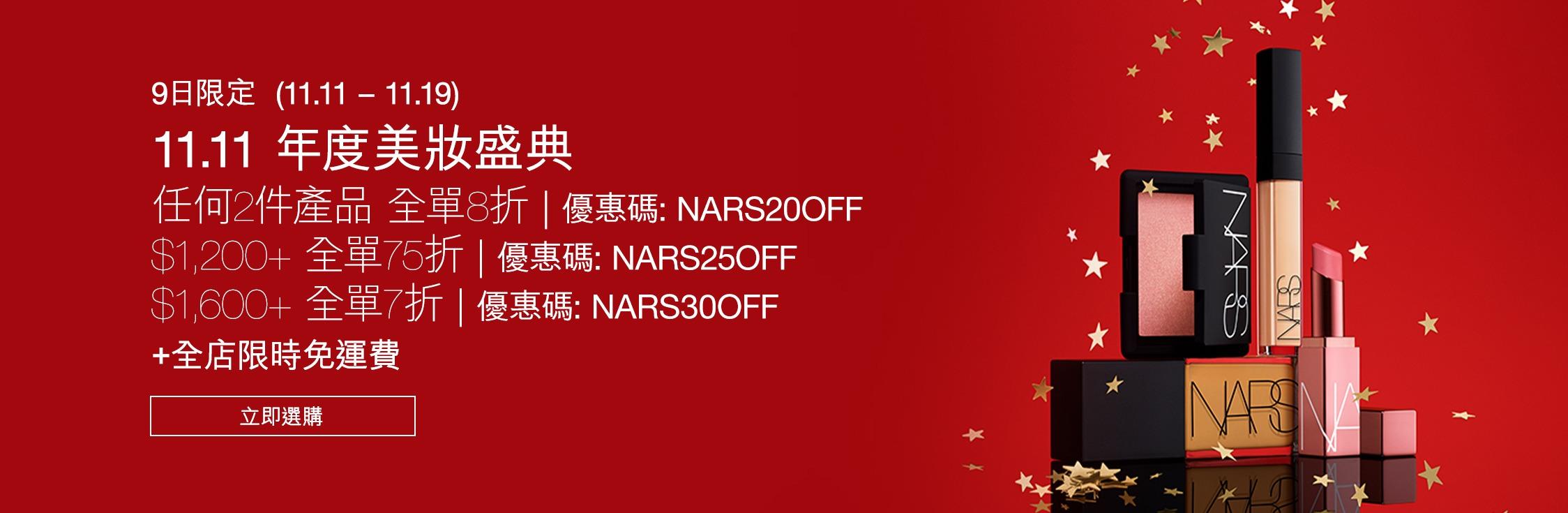NARS由11月11日至11月19日,在香港分店及官網同步舉行「11.11年度美妝盛典」,在店舖及網上購買任何2件正價產品即可獲全單8折【NARS20OFF】,官網購物更享限時滿額加倍優惠。網上購物滿$1,200可享75折優惠【NARS25OFF】,滿$1,600更可享低至7折折扣優惠 【NARS30OFF】,年末將至,是時候以時尚閃爍美妝好好犒賞努力了一年的自己。雙11過後還對NARS彩妝念念不忘的話,11月22至24日期間3款彩妝包括胭脂、眼影及唇膏推行3天快閃優惠。