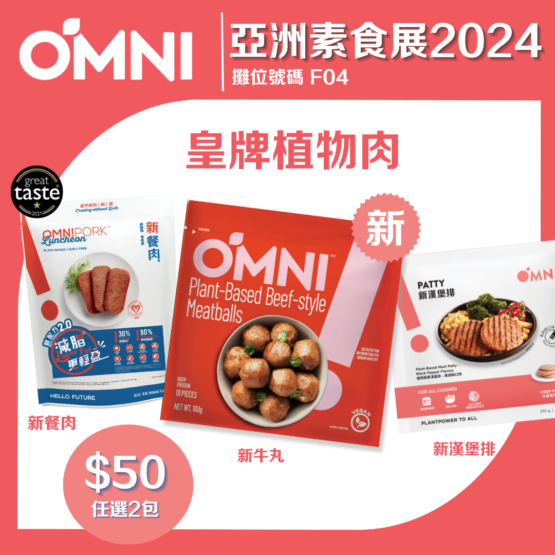 為回饙長期支持 OMNI的顧客,今次在亞洲素食展 OMNI推出多項爆抵優惠,包括:台灣直送田家千層烤餅$10/包,新豬肉及新肉絲$40/2 包,新餐肉、新牛丸及新漢堡排$50/任選 2 包,新魚堡、新炸魚條、新炸魚柳及新蟹位$50/任選 2 包,新吞拿$60/4 罐及原箱優惠$180/12 罐。心水推介會場限量福袋,只需$100即能一次過嚐盡多款植物肉產品,體驗零膽固醇的植物肉滋味,購買福袋更可獲贈實用保溫袋,一於到亞洲素食展搶購!如果想了解更多純素烹飪及 OMNI 產品入饌技巧,不妨於 3月 9-10日親臨現場的<素食廚房>,屆時將有由十里洋場行政總廚樂華宏及陳曉鶴師傅,及純素食譜作者 Priscilla Lam主持的烹飪示範。