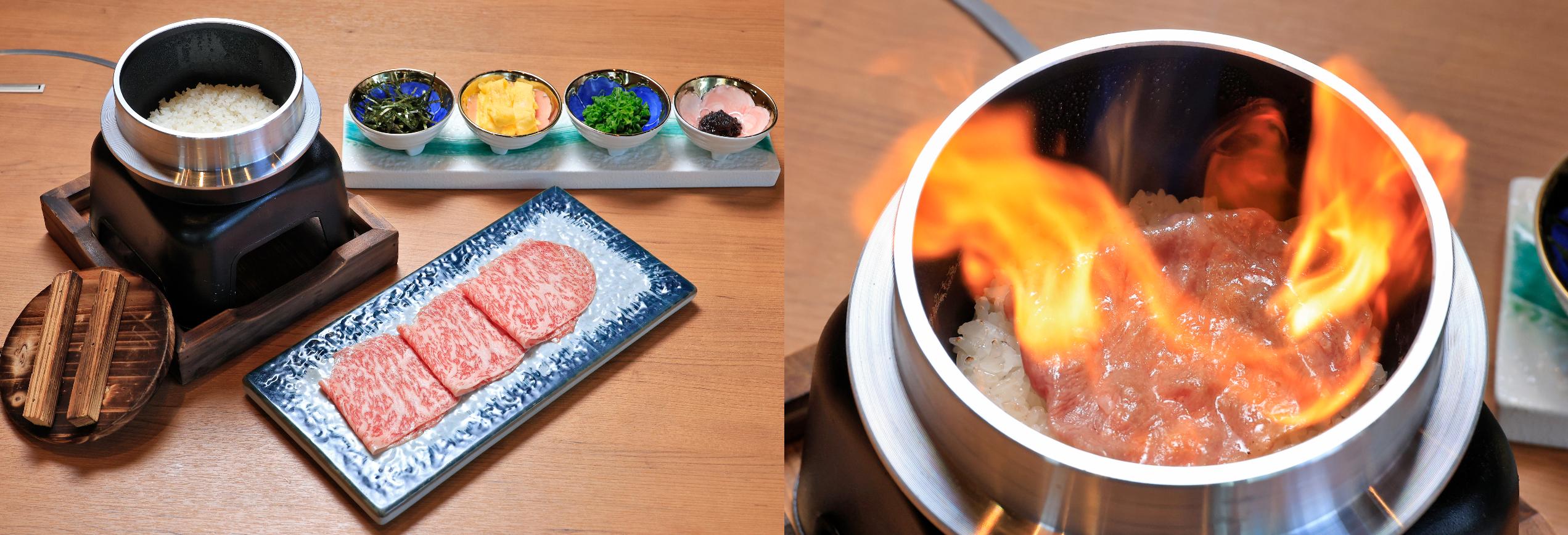 A5和牛釜飯 $280:店員會即席於客人面前,以火槍將和牛於白飯上燒熟,讓和牛的油脂能夠滲入米飯之中,油脂與白飯完美混合,每一口飯都帶有肉香。