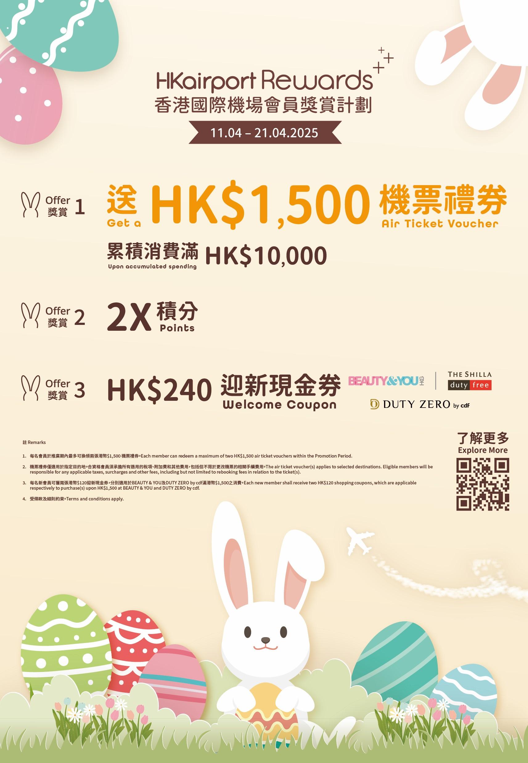 為迎接復活節,香港國際機場推出多重節日購物禮遇,讓旅客假期間享受購物樂趣同時,賺取豐厚回贈!即日起HKairport Rewards會員指定消費滿$10,000,即可獲贈$1,500國泰航空機票禮券,即睇詳請。